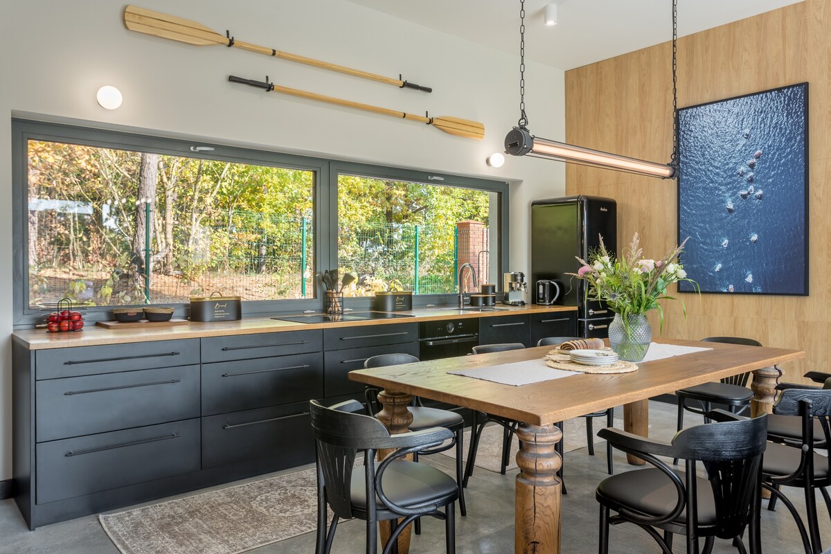 Look at the starry sky and forget about everything else. We present a beautiful apartment overlooking the river, two bedrooms, a living room with a kitchenette, a dining room and a bathroom, a kitchen fully equipped with a dishwasher and an oven, a washing machine in the bathroom, a large terrace with a barbecue area, a common area for all our guests with a hot tub, kayaks, a boat, a playground for children, a place for a bonfire and fishing platforms