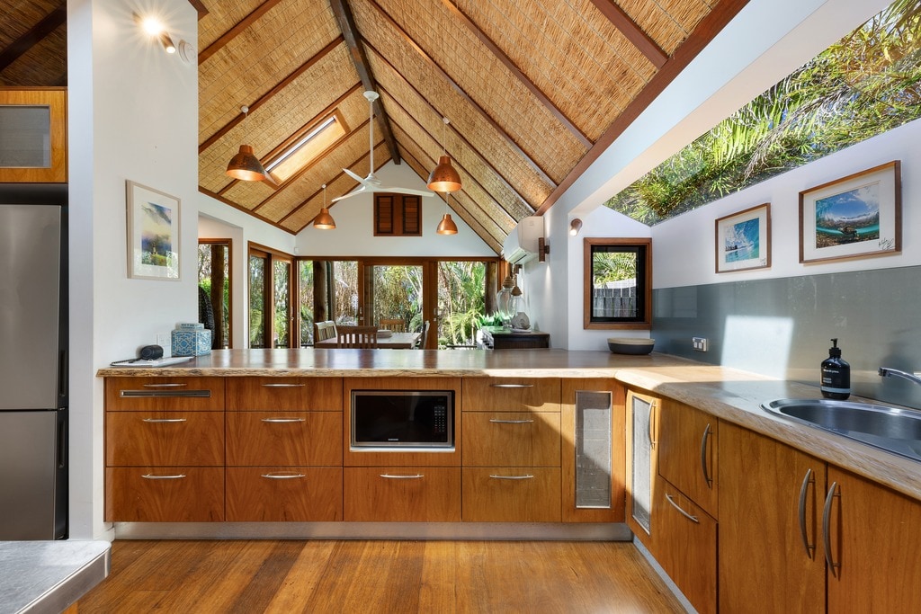 Unwind on the deck with a great book or take a short stroll to stunning Tallow's Beach and enjoy the sand and surf. All the essentials are packed into this comfortable studio, a kitchen, lush outdoor dining area, washing machine, dish washer, Nespresso coffee pod machine. Luxury details include plush linens, custom stonework bathroom, sunken rain shower and large bath tub with beautiful Leif bathroom products. Complimentary T2 Tea selection, Nespresso coffee pods.