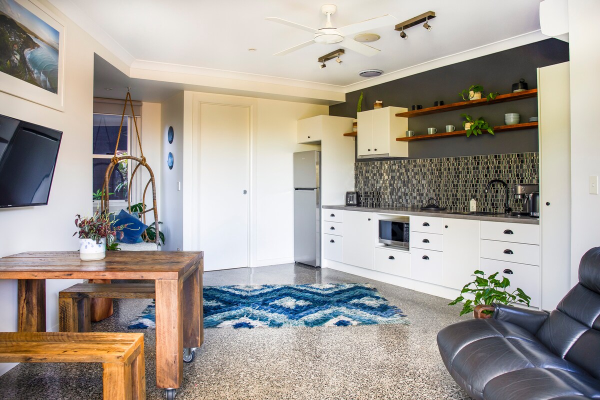 A calm stylish space. Designed for the discerning traveler, best suited for couples, singles or small families who want to be spoilt in this beautifully appointed studio space. Wake up to beautiful natural light & freshly ground coffee from the espresso machine, OR stroll to the shops via the beach. There's a seamless flow from outside in, with the alfresco bar linking courtyard to kitchen, perfect anytime. Finally finish a perfect day in king bed luxury, made with the finest linen
