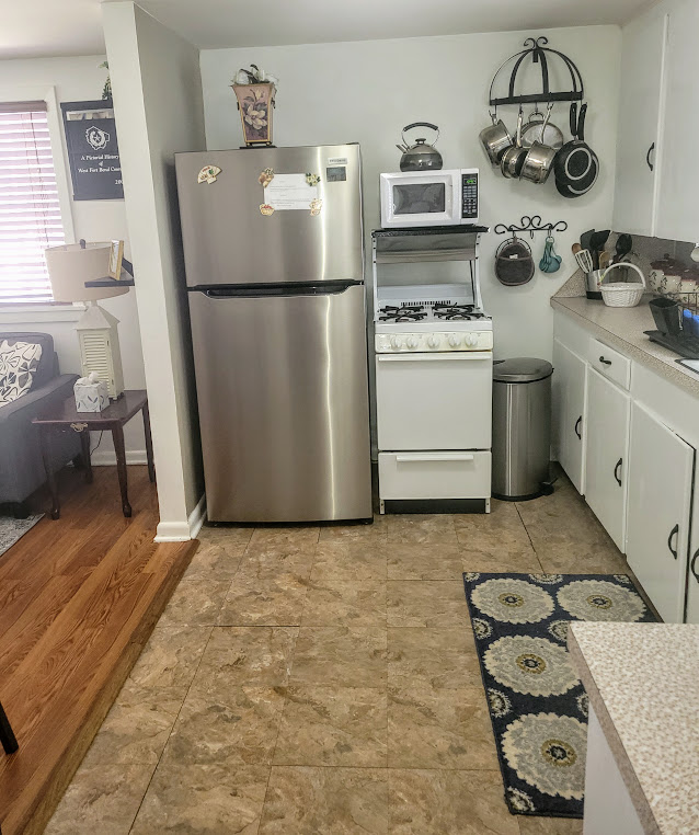 One bedroom 500 sq ft garage apartment with exterior stairs and entrance. Laminate and tile flooring with area rug in bedroom and living room. Fully equipped kitchen with gas range and full size refrigerator. Small dining table . Bedroom has queen size bed and dresser with built in closet as well as armoire. Quiet street close to old downtown Rosenberg. Antique shops and restaurants.