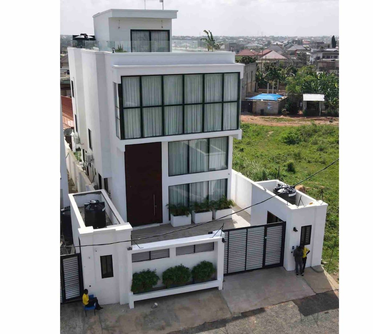 Lets make memories with this unique and family-friendly place. The property boasts of ample space open floor Cathedral HIGH ceiling Beam modern ranch design with a rooftop patio. The property is secured with High electric fence with automatic gate opener. Each bedroom has its own private full bathroom and a guest washroom. All tared roads from Airport to the villa (35 minutes drive) in the Botanical Gardens of Aburi, very close to the National Fire Service.