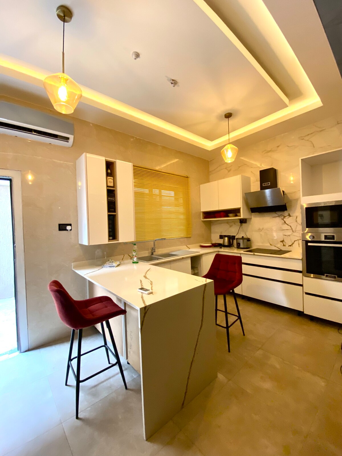 Grand suit is a 3bedroom in a gated community with 24hr security guards, CCTV surveillance and barb wire. Grand Vista is fitted with modern home appliances, Kitchen appliances amenities that make life comfortable. The living area is fitted with 80" TV set, aesthetically appealing but comfortable Sofa, well laid out dinning and bar area. The back yard offers outdoor furniture for family relaxation and dining. Tha balcony is fitted with Automatic retractable awning, fully LED.