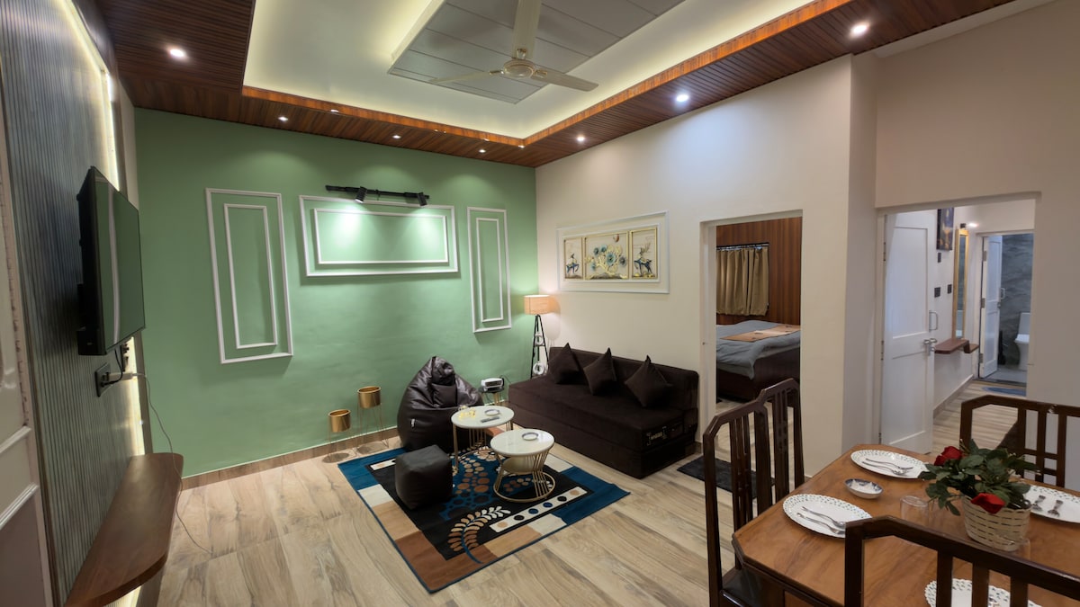 Your family will be close to everything when you stay at this centrally-located place. You will find the Drawing Room when you enter the property, along with a Balcony. The room after that is a Master Bedroom with a king size bed and then there is a Connecting Room with a sofa cum bed of the size of a king size bed. All three rooms are interconnected and then at the last is a fully equipped kitchen and a bathroom. The property is well suited for a family of 4 with ample space to relax.