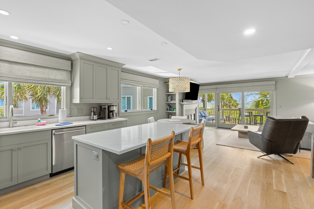 Enjoy breathtaking beachfront sunrises and dining at a cozy table on your own covered balcony. The private pier and pool are only steps away from the ocean. View stunning sunsets and Sullivan's Island Lighthouse from the bedroom and entrance. Nautical decor, premium vinyl plank floors, and shiplap walls coalesce within this bright apartment retaining an ethos of southern charm. The gourmet kitchen is well-equipped with full-size appliances, ice-maker, filtered water dispenser, granite countertop, under-counter lighting and a convenient coffee bar with multiple brew options! The panoramic ocean views are the best available at Sea Cabins! Located on the 3rd floor, it's just 3 doors from the end of building C. Enjoy beautiful sunrises right from the living room, kitchen, or balcony, and sunset views of Sullivan's Island Lighthouse from the front door or bedroom window. You will have private access to the beach, community pool, and fishing pier. Island shopping, restaurants, groceries and entertainment are just steps away! It is conveniently located near Mt. Pleasant, Shem Creek, and historic downtown Charleston, giving you unlimited choices for dining, shopping, and entertainment. This home sleeps 4 with a queen size bed and a queen sleeper sofa with memory foam mattress. Enjoy your meals at the bar or on the balcony. Outdoor grilling facilities and picnic tables are also available. The pool-house features private bathrooms and a coin-operated laundry. Access by stairs only (no elevator). Full Absentee host The apartment is located in Isle of Palms, a city on the slender barrier island of the same name. It’s known for its beaches backed by condos and eateries. Sea turtles nest in the area. A nearby park includes a beach, picnic areas, and a playground. Dining, shopping, and entertainment within walking distance. Only a short drive to historic Charleston, SC! Please be aware that the property has a Ring video doorbell on the premises (at the front door). There are no cameras/surveillance devices inside the home or on the balcony.