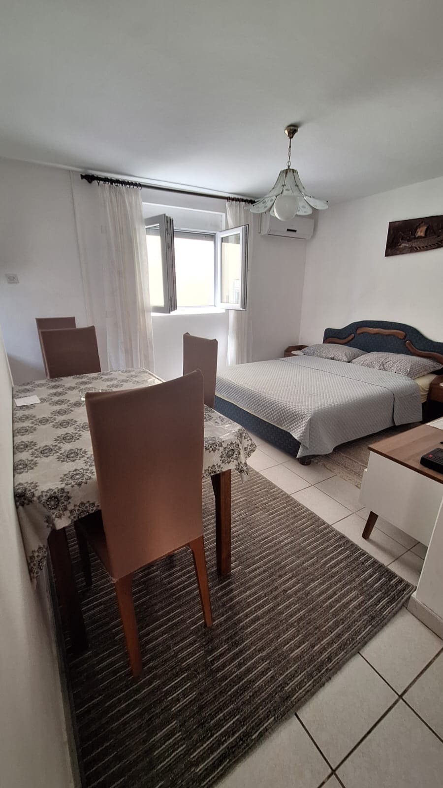 Tiny studio on a 2nd floor facing North, Susanj mountain. The apartment is in a two-story building 600 meters from the Šušanj beach near IDEA & AROMA supermarkets. Has an access to a shared balcony/terrace with a garden table and a 2 chair set. The apartment has modern new appliances, Samsung inverter air conditioners, inverter washing machine on the floor, microwave, marble kitchen countertop & granite sink, bathroom bidet shower & infrared heater.