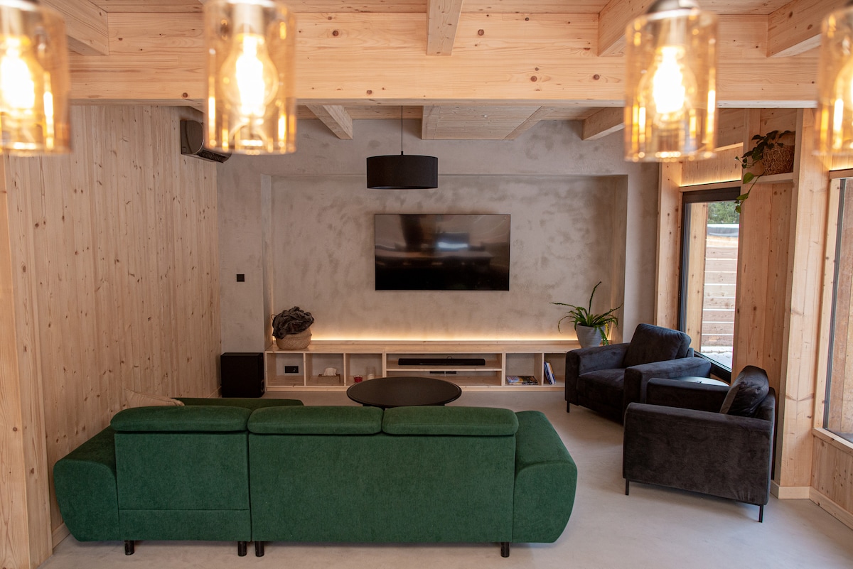 A luxurious and stylishly furnished mountain chalet with a private wellness center a huge whirlpool and a Finnish sauna with a cooling pool and a summer outdoor pool. Inside the cottage, everything is furnished for comfortable living. In the luxuriously equipped rooms, comfortable beds, high-quality bedding and stylish furniture. The building consisting of a cottage with twenty beds and a wellness center is suitable for groups of up to twenty people, family vacations, team-buildings, etc.
