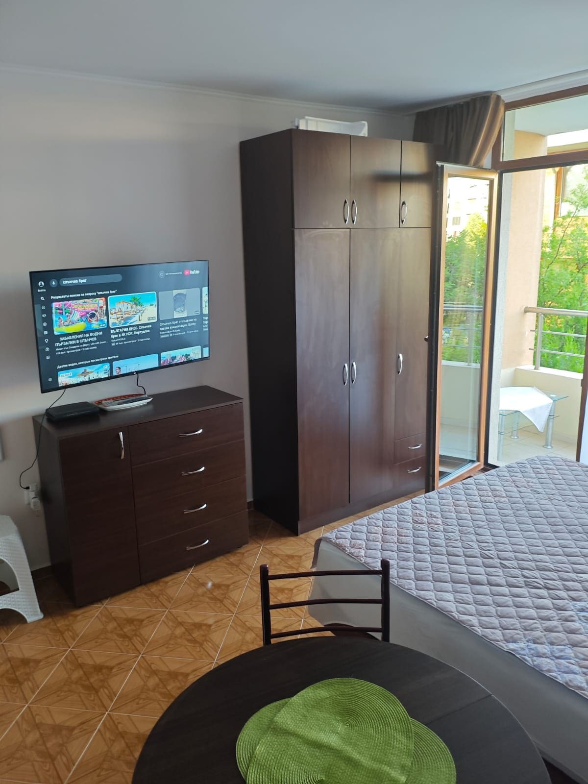 Studio in Sunny Beach and Nessebar with pool, 5 minutes walk from the famous Cacao Beach. Meters from the best nightclubs and bars. 20 minutes' walk from the center of Sunny Beach and the old town of Nessebar. The studio has high quality Magniflex mattresses, a 55-inch QLED TV with EON and HBO Max, high-speed 5G Wi-Fi, the studio includes a bathroom with a shower, air conditioning, a workplace, a microwave, a kettle, a wardrobe and a panoramic window overlooking the sea. Free coffee.