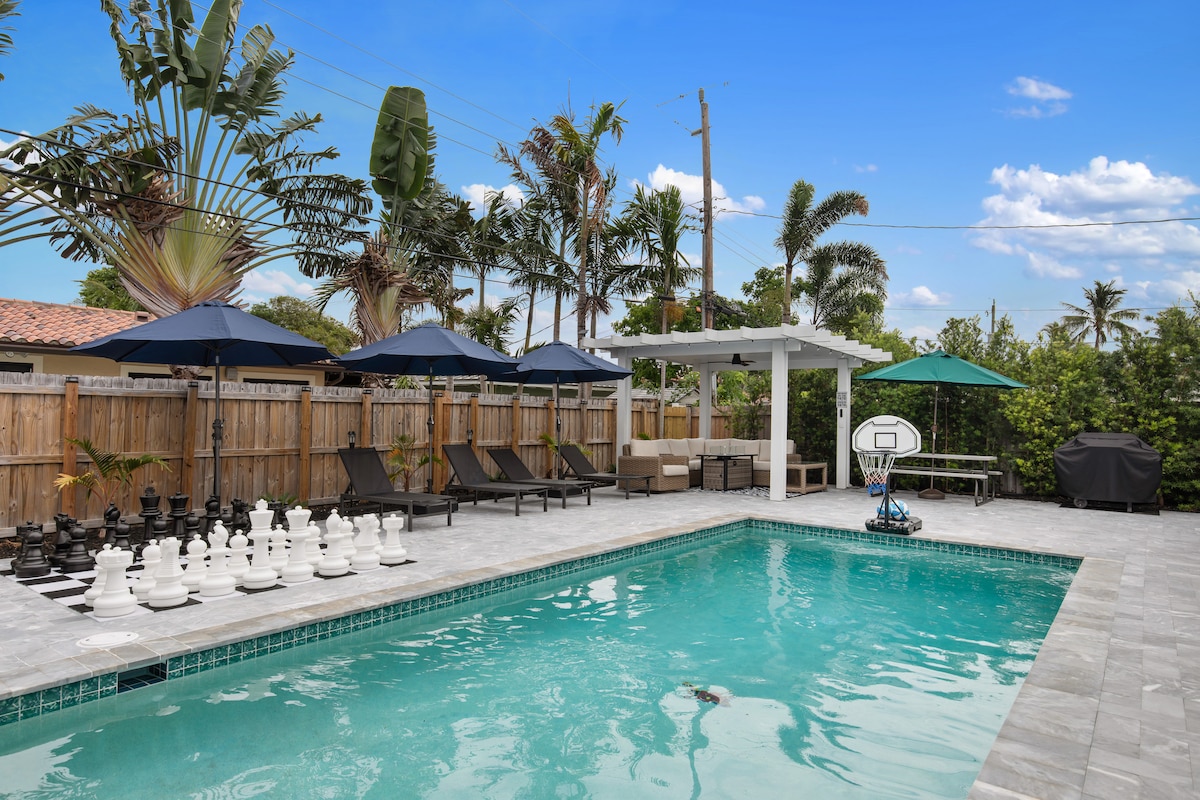 Welcome to Sunhouse, your private pool oasis in the perfect location: just 1 mile from the beach and the Pompano Beach Fishing Village! This house is the perfect Florida escape with everything you need plus the luxury of your own (BIG) heated pool! Relax in the backyard with comfy loungers, adirondack chairs, BBQ, and pool toys. Want to explore? Hop on our bikes for a quick 10-minute ride to one of Florida's best beaches, where you'll find great restaurants & shops!