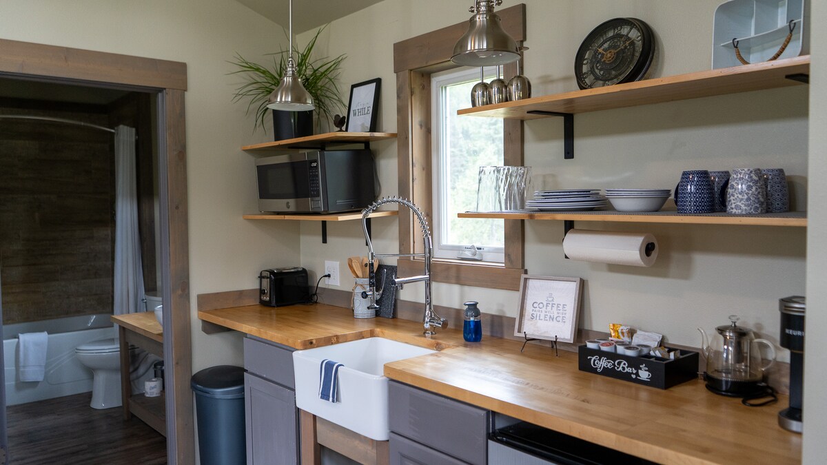 Secluded solar powered tiny house with King size bed, black out blinds, kitchen. deck, BBQ,hot and cold running water and a composting toilet. Wood stove, Wood provided. The cabin will be warm when you arrive. Stereo with bluetooth. Pets are welcome I have worked hard to create a place that I would want to stay in. I hope you enjoy it! Please share any ideas to make it better! WiFi and good cell coverage.