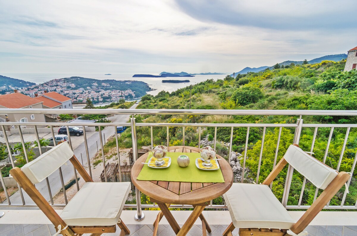 Nia -brand new fully equipped two-bedroom deluxe apartment placed on small hill boosting spectacular Sea Views over Adriatic sea and whole Dubrovnik city!:) Apartment has spacious private terrace with outdoor seating area & sundecks. Free wi-fi, flat screen smart TV with cable channels and air-condition in every room is available. Guests have free Parking and must climb stairs to reach apartment entrance. Public bus stop is below apartment & UNESCO protected OldTown is just 3km away.