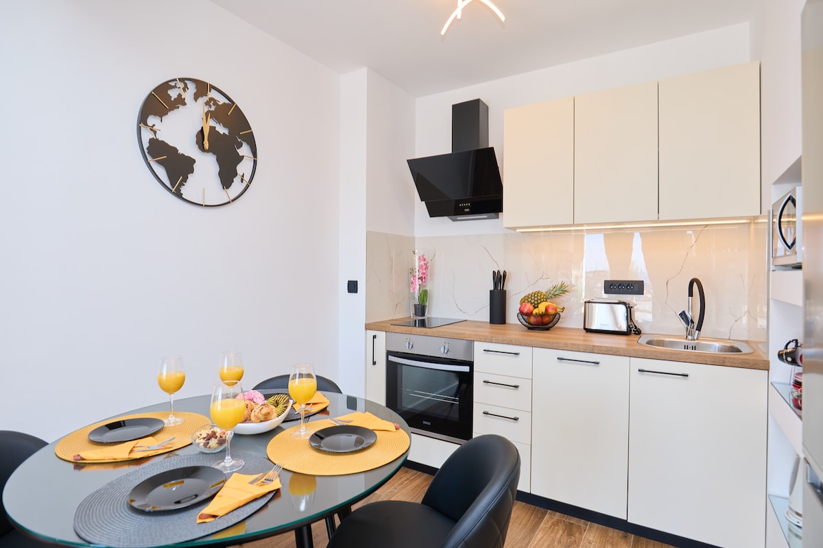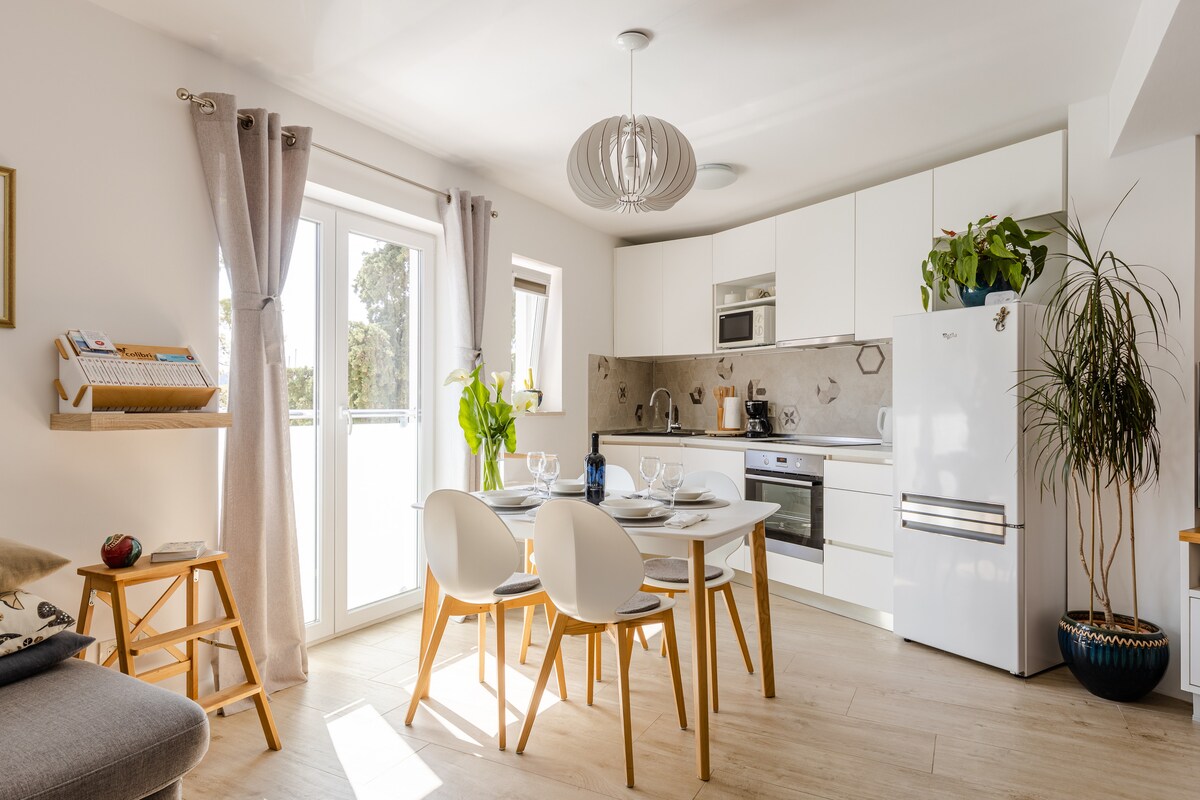 Enjoy long walks by exploring the nearby beaches and walking trails. Later, look out to sea from the spacious terrace and plan the next day's trips. The airy interior features a floating staircase, walk-in rain showers, and underfloor heating. Prepare yourself a delicious meal in a fully equipped kitchen. Interesting two-floor interior consists of a living room, kitchen and a dining room combined, two bedrooms with own bathrooms, and a wide terrace with a sea view. The apartment is very spacious and can comfortably host five adults. Each bedroom has a double bed, closet and a working desk with a wireless charging lamp. Extendable corner set sofa in the living room is suitable for 1-2 persons, while the central dining table is extendable for six. Our guests can easily relax in the apartment as it offers three smart LED TVs, air-conditioning, underfloor heating, Wi-Fi, fully functional kitchen equipped with a dishwasher, microwave, oven, kettle, coffee machine, and an extensive selection of kitchen utensils. Spacious terrace is perfect for relaxation on four loungers, for having early breakfast or a romantic dinner while enjoying the sea view, and the scent of the sea, pine and cypress trees. To our dear future guests, we are fully at your disposal for any question or help you might need. We will certainly do our best to make your vacation pleasant and delightful. Beaches, walking trails and parks are all close, together with shops, market, cafes, and bars. Located on Lapad peninsula, in a quiet part of Dubrovnik, dining recommendations include a fish restaurant, also called Orsan, in front of the apartment. The apartment is approximately 200 m away from the bus stop from which the bus number 6 will take you to the Old Town. There is a public parking space in front of the apartment, which is partly free of charge. Beaches, walking trails and parks are all close, together with shops, cafes and bars. Located on Lapad peninsula, in a quiet part of Dubrovnik, dining recommendations include a fish restaurant, also called Orsan, in front of the apartment. Local market is very close where you can find delicious groceries for your meal.