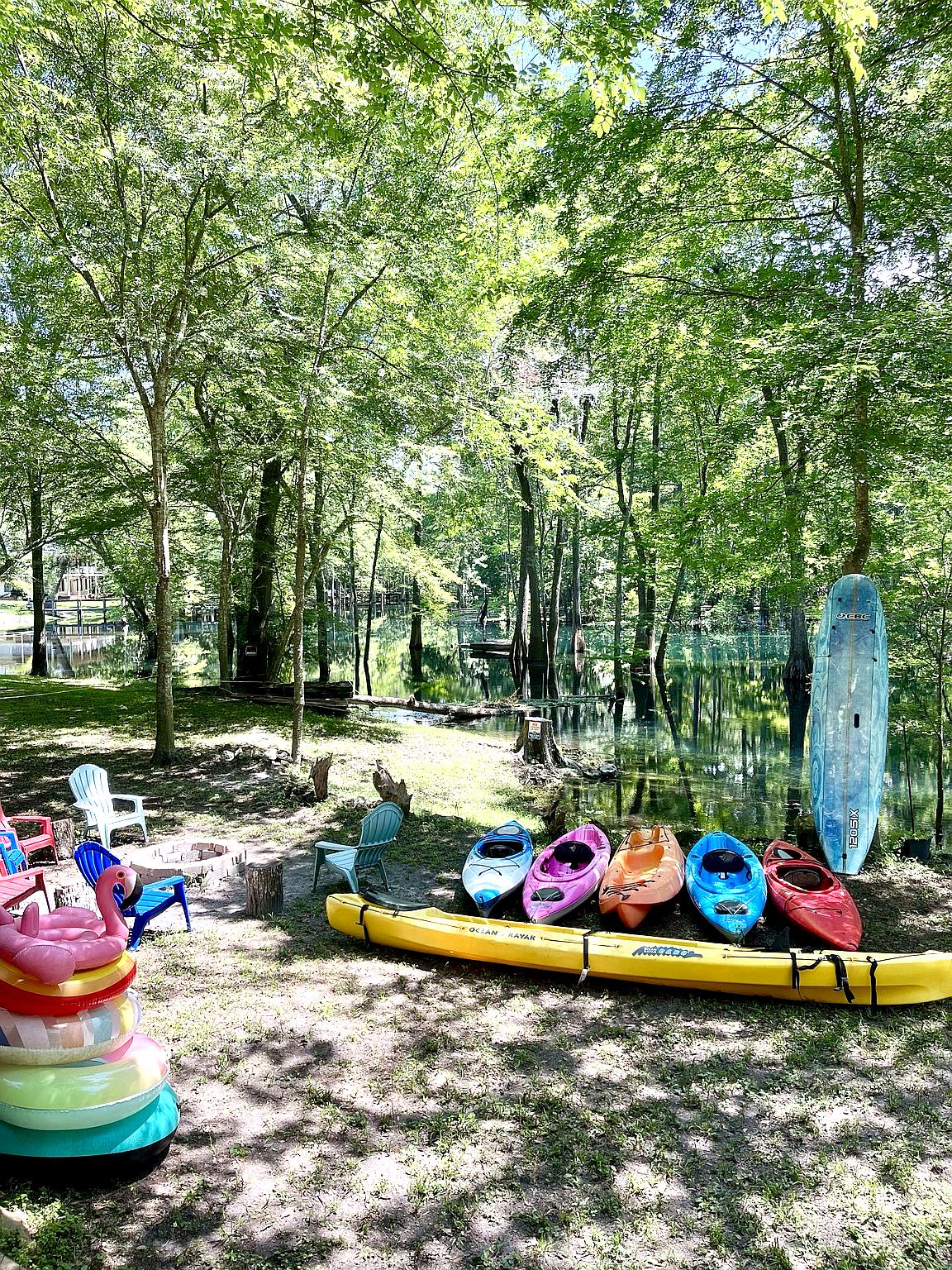 Camp Manatee is a magical estate situated on approximately 3 acres with over 650 feet of direct Santa Fe River frontage with a stilt home elevated over the ground by 30+ feet. This gives you an incredible vantage point of the expansive property from the home and wrap-around porches. The home is approximately 1,500 square feet with 3 bedrooms and 2 full bathrooms and sleeps (8) people comfortably. We offer complimentary kayaks for guests to use during their stay. Inquire about our boat rental!