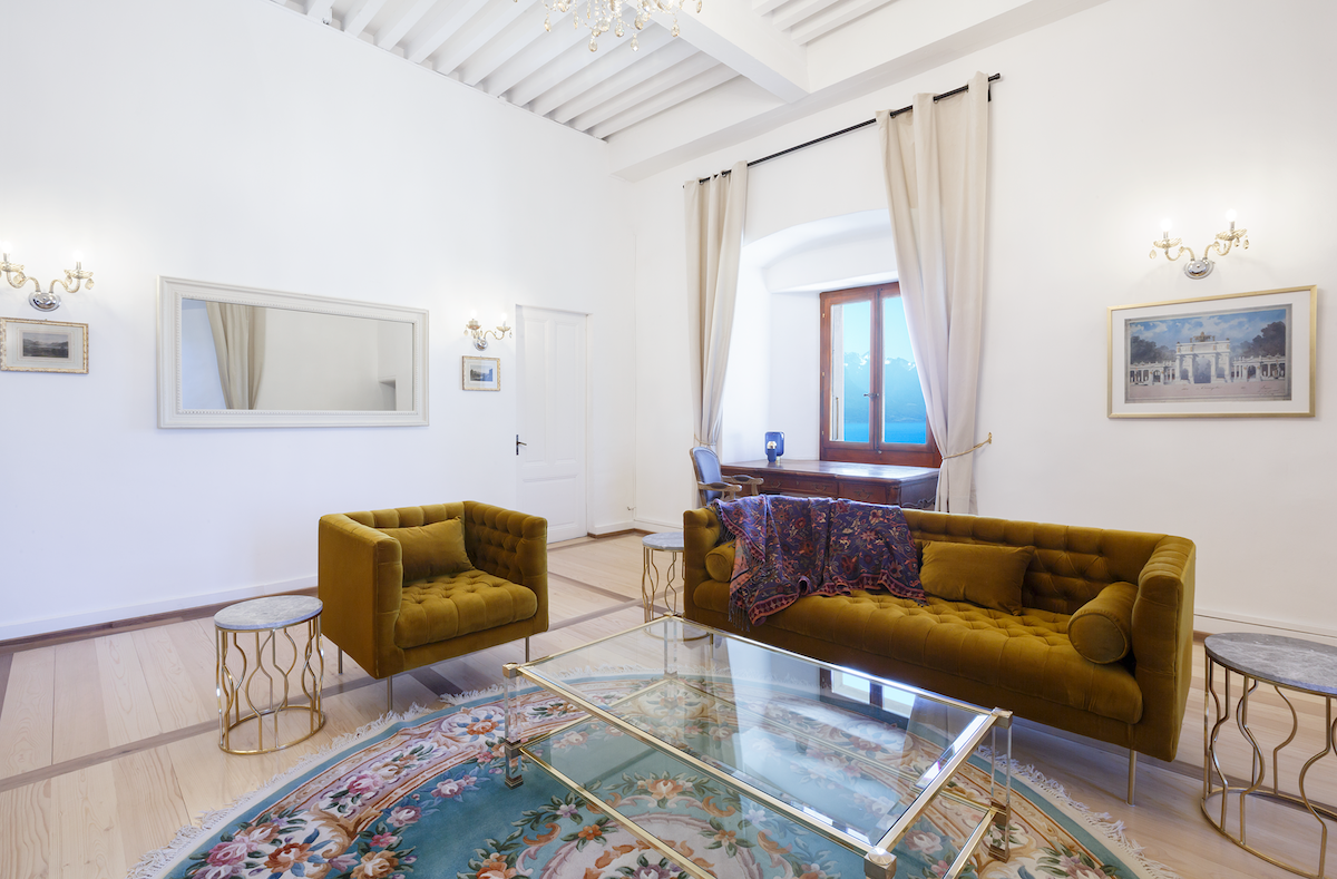 Spacious apartment in a 15th-century castle — the main residence of the estate. It features four bedrooms and the castle’s crown jewel: a magnificent historic library with carved wooden details. The apartment offers a vast living space, panoramic lake views from several rooms, a small private balcony, and access to a shared terrace. Please note, as in any ancient castle, occasional spiders may appear — part of its authentic medieval charm.