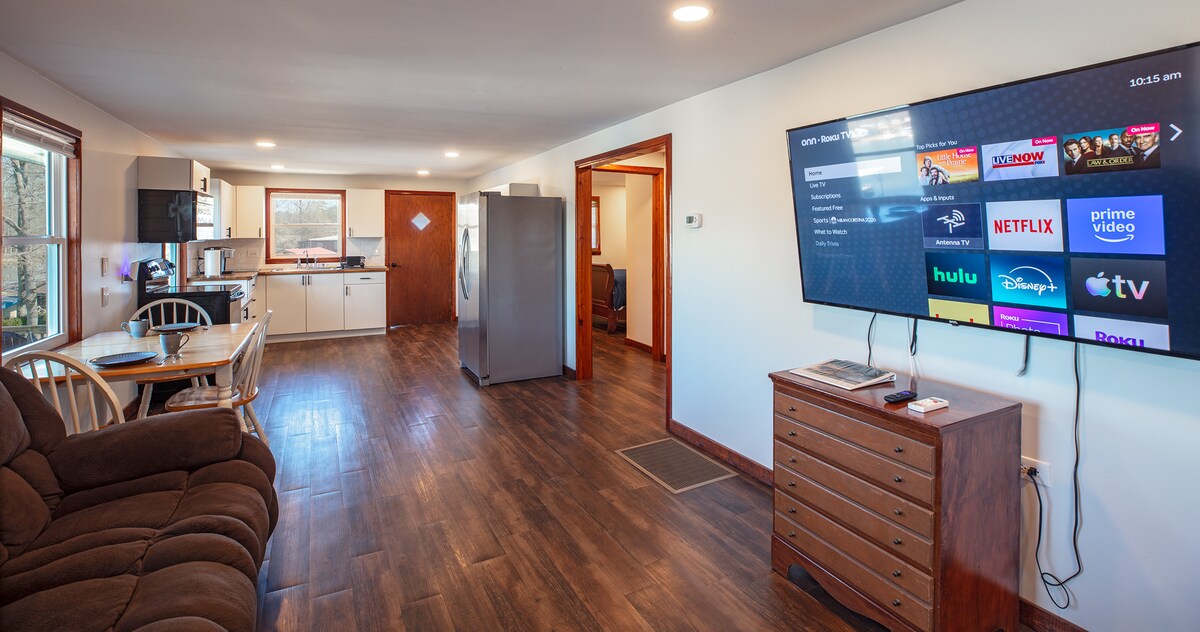 Escape to this stunning 2BR/1BA lakefront retreat where the water meets the river! Enjoy panoramic views from the massive deck—perfect for wildlife watching. 🛶 Water Fun: Private dock, boat house, fish cleaning station, & free launch nearby. Includes a jon boat, canoe, & kayak! 🏠 Comforts: Large stocked kitchen, 75” Smart TV, laundry, & board games. 🚗 Easy Access: Just 3 steps to the door with ample parking. Your perfect blend of adventure and relaxation awaits!