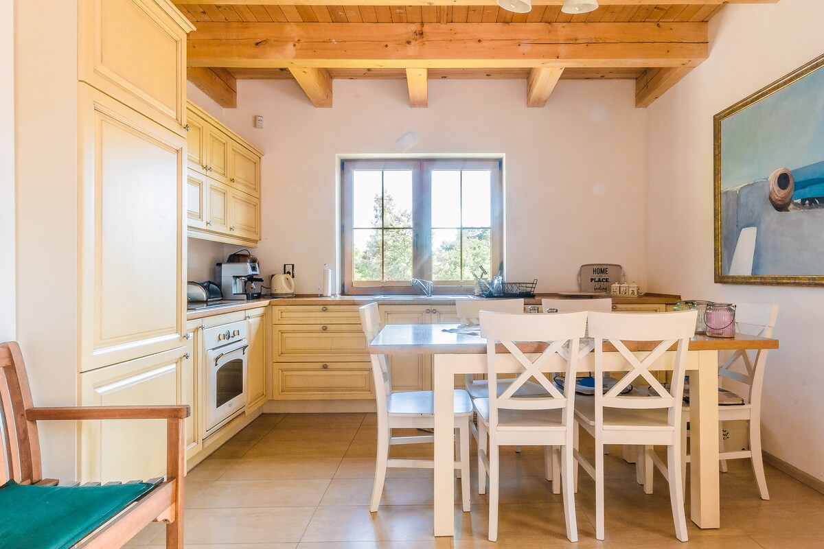 We rent out a whole wooden year-round house from 2015. Ground floor: 2 rooms, living room with TV, kitchen, dining area and exit to a large wooden terrace. There is a shared bathroom on the ground floor. Attic: a bedroom with a balcony and two rooms, including one with a balcony and a shared spacious bathroom. The rooms have double beds, bed linen and towels. Kitchen with dishwasher, stove, fridge, toaster. Bathrooms are equipped with towels, a hairdryer, and a shower.