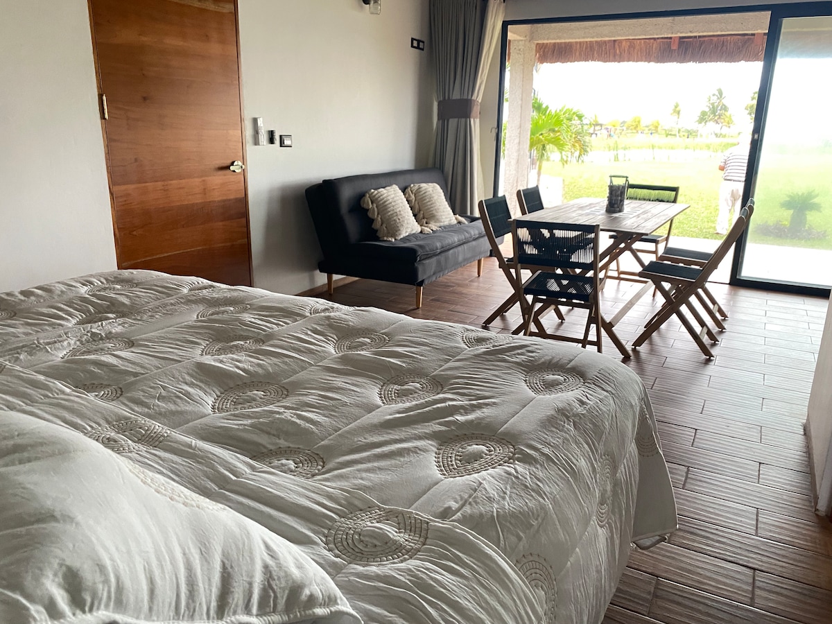 Bungalito Villaplacencia is located in Playa Pelícanos in Centla, Tabasco. Mexico. (next to Miramar). Only 45 minutes from Villahermosa. It has a king size bed, a sofa bed, an equipped kitchen and a full bathroom. It's ideal for a couple or family of 2 adults and two small children. It is a unique accommodation surrounded by nature and overlooking the lake and the sea. The perfect plan to rest or spend time with the family enjoying the beach or the pool. There may be noise on Saturdays.