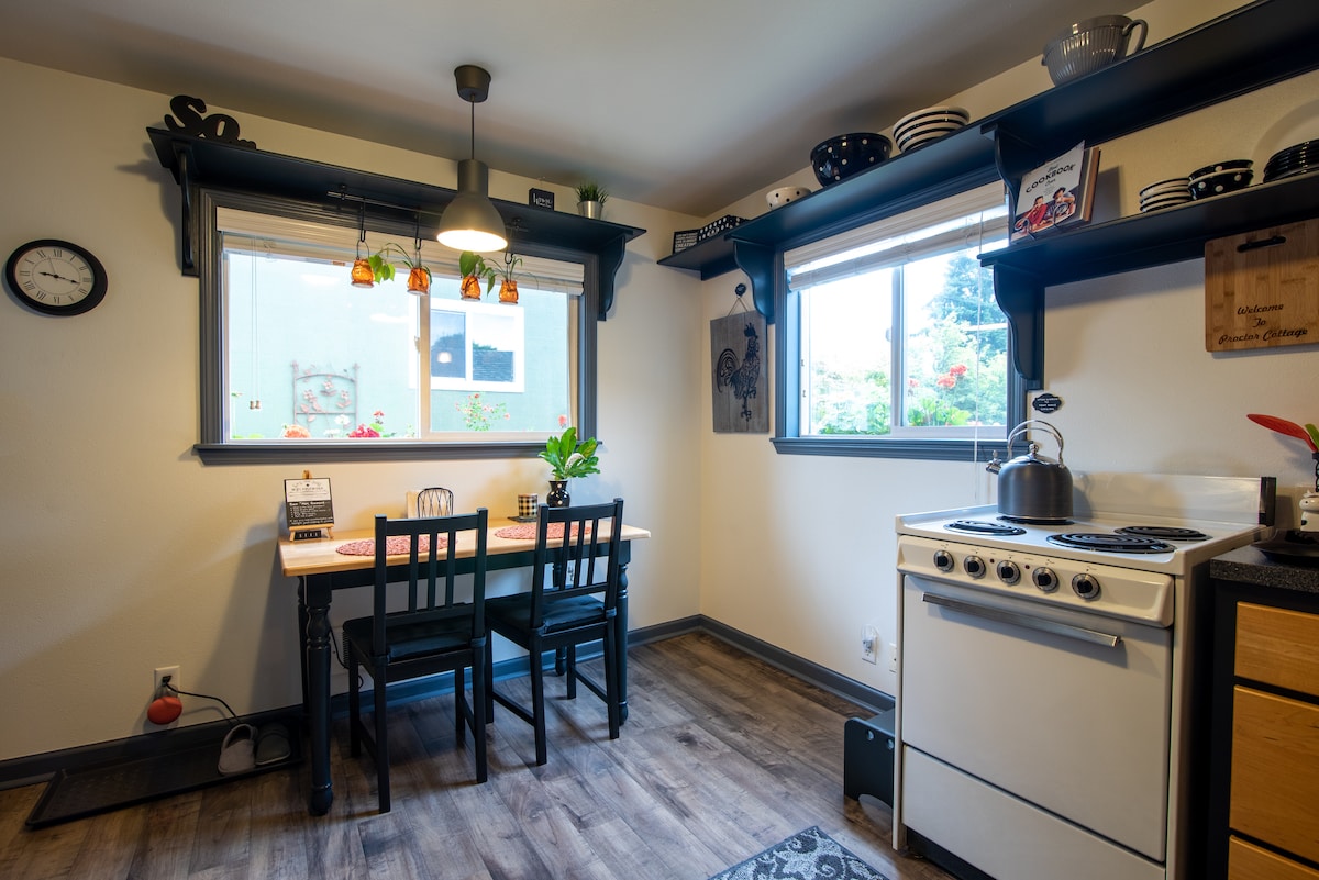 Modern farmhouse cottage on Lake Sammamish—2 bed / 2 bath with A/C and gas fireplace. Both bedrooms feature plush down comforters and pillows. Enjoy hardwood floors, a well-equipped kitchen with new appliances, washer/dryer, dining for 6, a sleeper sofa, 55” TV, and coffee bar. Relax with lakeview dining, kayak the shoreline, or explore the Lake Sammamish Trail just outside your door. Well-behaved dogs welcome!