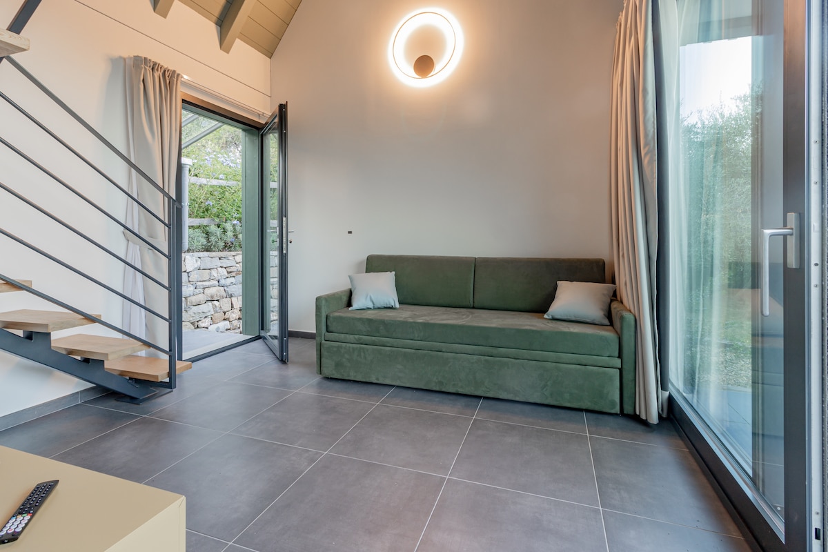 Welcome to this beautiful detached wooden blockhouse, immersed in greenery and surrounded by olive trees, ideal for those seeking relaxation and privacy without sacrificing comfort. The modern and bright house features French windows that illuminate both the living room and the bedrooms. Outside you will find a spacious panoramic terrace with a dining table for 6 people, 2 comfortable sun loungers for sunbathing and a cosy garden with outdoor seating area.