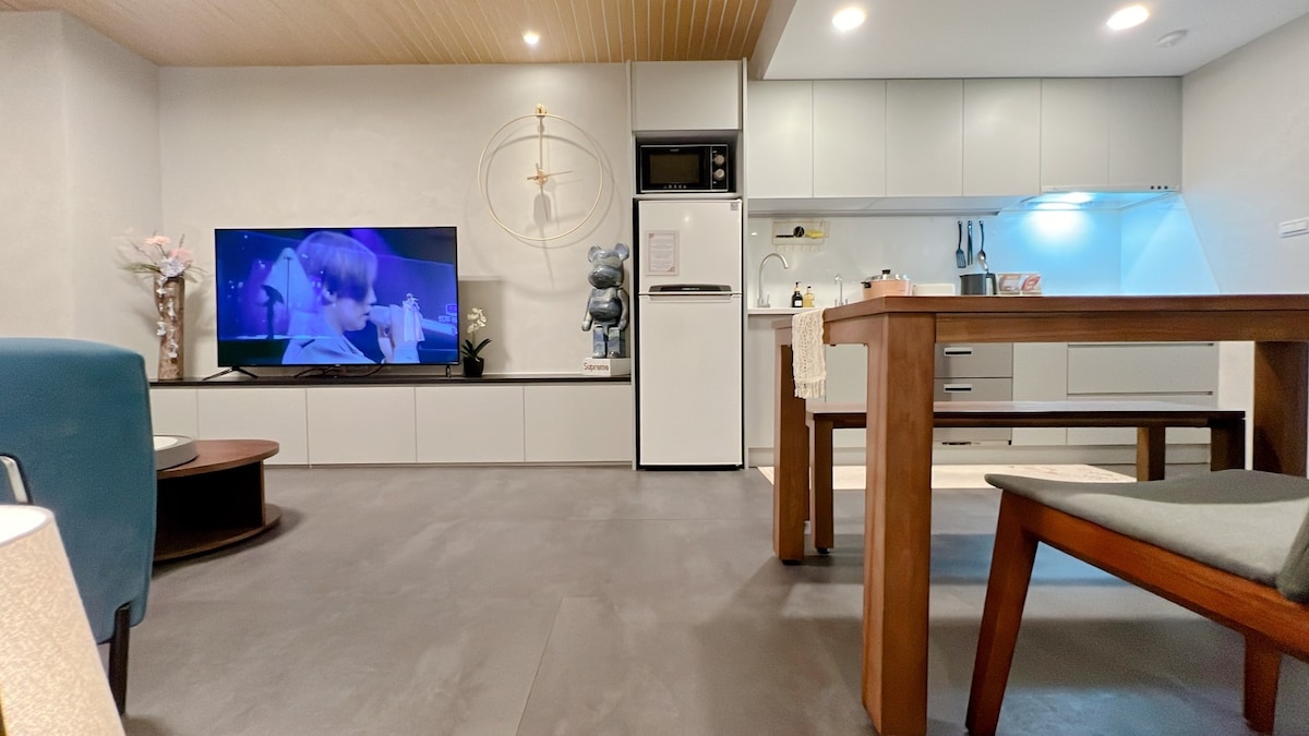 - GoogIe "Traveler's House" can find us. - Check-in time is 3pm. You can leave your luggage first - THe Residence is an apartment-style B&B in Zhongzheng District, Taipei City. There are 9 apartments of different sizes. Can fit up to 20 people. - Washing and drying machine in common space, shared by 9 apartments - Daily garbage collection, luggage storage - Convenient transportation, 5 minutes walk to Guting MRT station. 10 minutes walk to Shida Night Market, Yongkang Business District. - There is a 7-11 next to the building, and a supermarket within 5 minutes walk, so you don't have to worry about daily necessities. - High-quality elevator building, brand new elevator safety guaranteed, THe Residence is located on a high floor with beautiful views. - 43-inch LED TV, HD channels, free Wi-Fi, refrigerator, hair dryer and iron, fully equipped. Stylish new bathroom amenities with bath towels, shower gel, and shampoo.