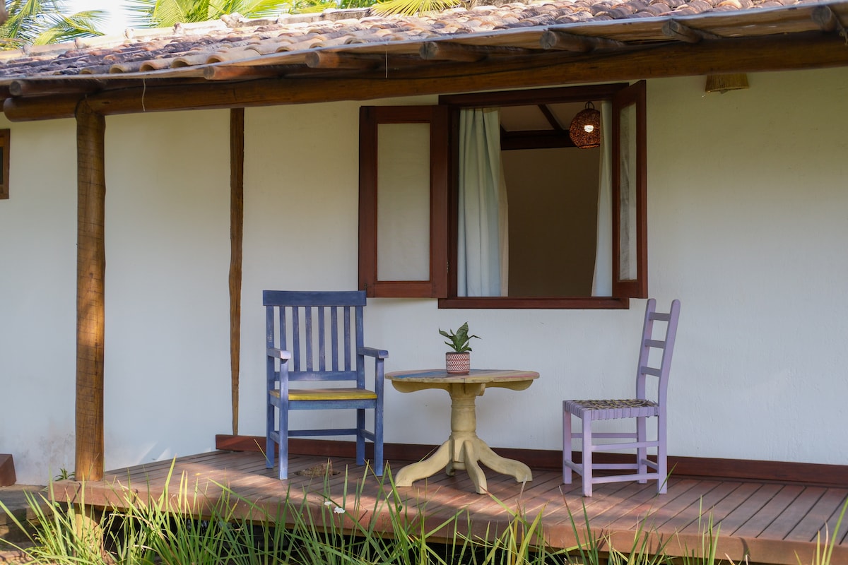 Fuja do agito neste Bangalô Master Térreo de 45m². Perfeito para quem busca silêncio, privacidade e poucos hóspedes. Relaxe na rede da sua varanda privativa com vista para o lago ou caminhe 200m até o mar. Possui uma cama King, duas camas de solteiro, ar-condicionado e Wi-Fi. Um refúgio acolhedor com espaços para a família e o barulho relaxante da natureza. Viva a Península de Maraú com calma e exclusividade. ✨