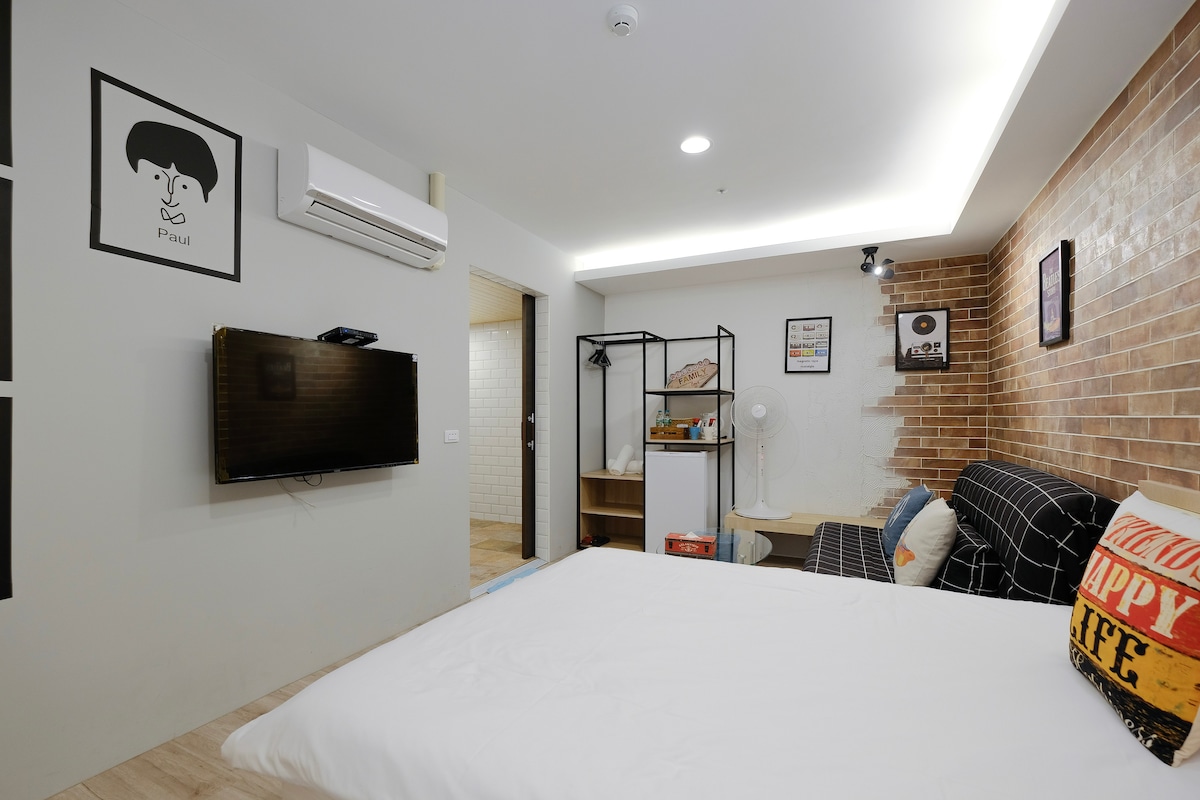 Located in the lively Sanduo business district of Kaohsiung City, about 3-5 minutes walk from Sanduo MRT Station, about 15 minutes to Kaohsiung Xiaogang Airport, about 10 minutes to Kaohsiung Station, about 20 minutes to Xin Zuoying Station (High Speed Rail), in addition to Metro public transport, the light rail also joins the ranks of public transport, about 10 minutes walk to easily reach the light rail station (C8), to Kaohsiung's major attractions, no need to travel by boat, nearby Pacific SOGO Department Store, Shin Kong Mitsukoshi Department Store and Far Eastern Department Store, IKEA, MLD Formosa Boulevard and Carrefour are also about a 10-minute walk away. In addition to the major department stores, there are also Ziqian Night Market and Xingzhong Night Market waiting for travelers to explore all kinds of traditional snacks. In addition, in terms of humanities, there is a very special architectural method, the Kaohsiung Library, which uses suspended steel bars, lightweight design, and glass curtains, so it is also the most penetrable library in the world. I believe that choosing this accommodation is definitely the best choice, whether it is location, shopping, or transportation, it is very convenient. The "British-style room" interior style is based on strong red brick walls and subway tiles. Although the room does not have windows, the overall layout of the room allows guests to get a comfortable and relaxing rest and sleeping space during their full trip. The room is equipped with a complete set of private bathroom facilities, so that guests can have a private space to wash away their fatigue. The key point is that the price is very reasonable, and it will definitely make your trip worthwhile.