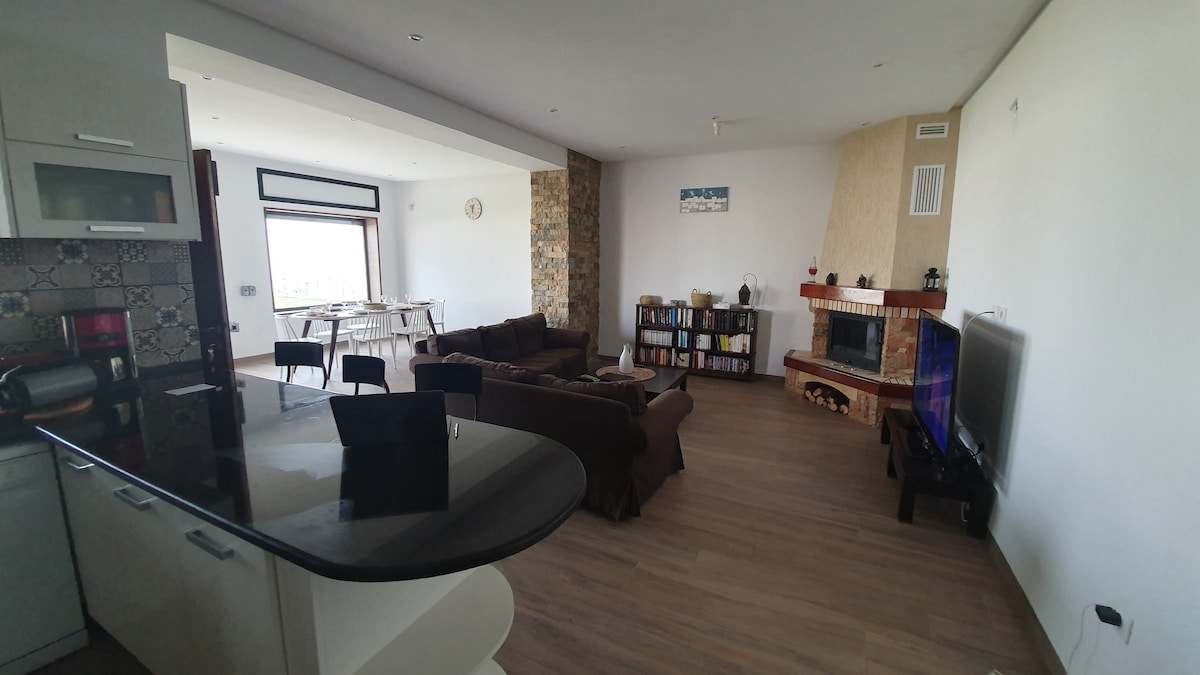 L'appartement est situé au 1er étage d'une villa, avec une entrée séparée , 4 terrasses privées. Vue sur la mer et les montagnes . RESTRICTIONS: Pas d’enfants en-dessous de 10 ans dû aux grandes ouvertures dans les balustrades. L appartement est entouré d'un grand jardin. Distance de la plage : environ 10 min à pied en passant entre les oliviers. Un quart d’heure de marche et vous êtes au centre d’Hergla. Dans le grand jardin les poules et canard circule librement.