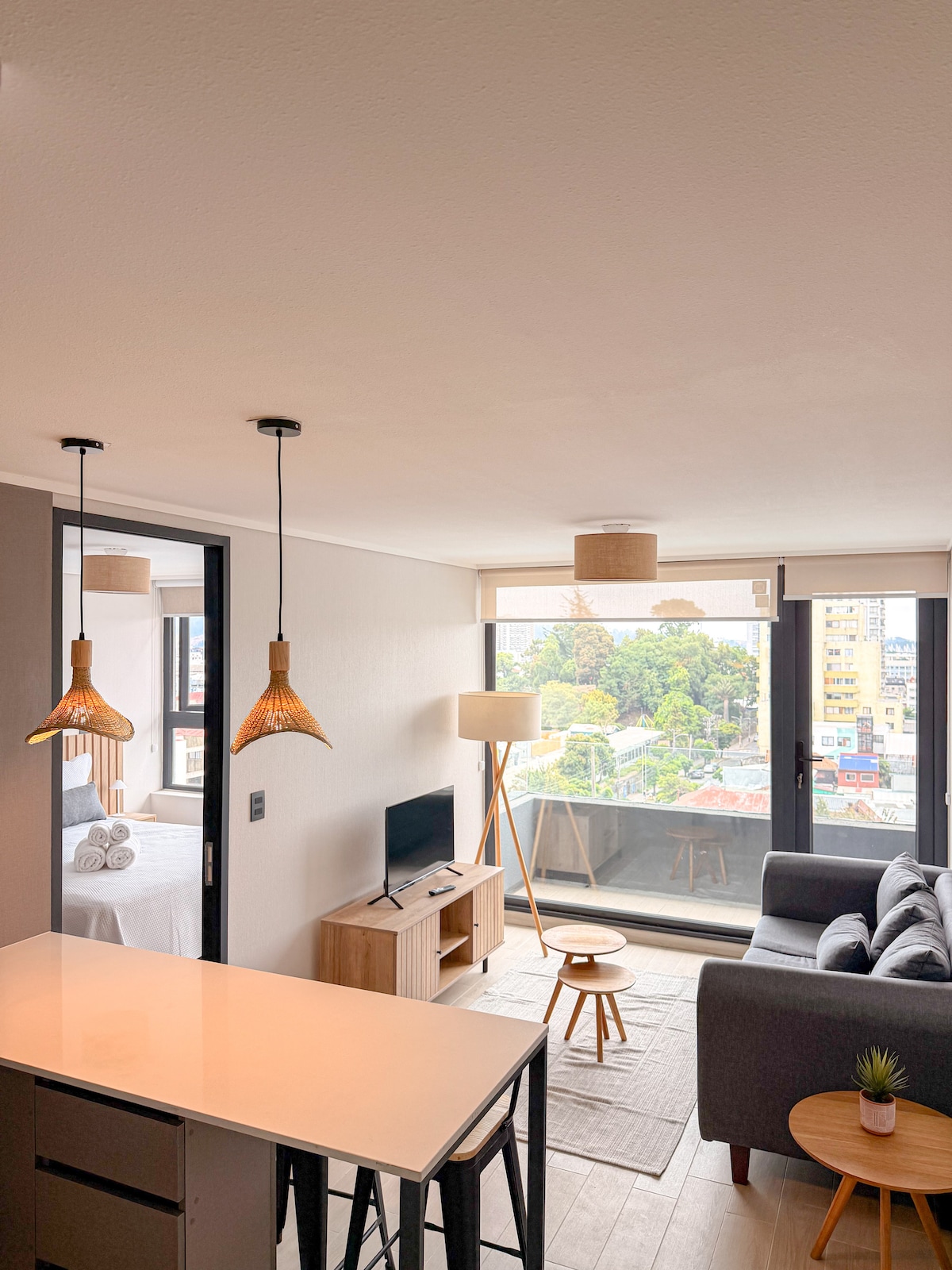 Modern 1-bedroom apartment on the 15th floor with panoramic views of Concepción and unique sunsets 🌇. Bright and cozy space, ideal for relaxing, working, or long stays. Features a comfortable living room 🛋️, fully equipped kitchen 👩🍳, fast Wi-Fi 🛜, TV with Netflix/Disney+ 📺, and a double bed 🛏️. Centrally located, just steps from downtown, universities, restaurants, and public transport 🚍. 🔔 Automatic discounts from 2 nights 😌