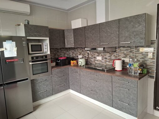 Our apartment just off the main airport road is a quiet place to relax. It's only 10 mins walk or 2 mins drive to the airport & 5 mins drive to the nearest supermarket. The apartment is fully furnished with 8-seater sofa, 55” TV, TV Box, 8-seater Dining Table, Kitchen complete with Stove, Oven, Rice Cooker, Freezer, Kettle, Cutlery, Washing Machine. The garden comes with a mini playground for the children and a BBQ Pit. A car park is also provided for those who is have their own vehicle.