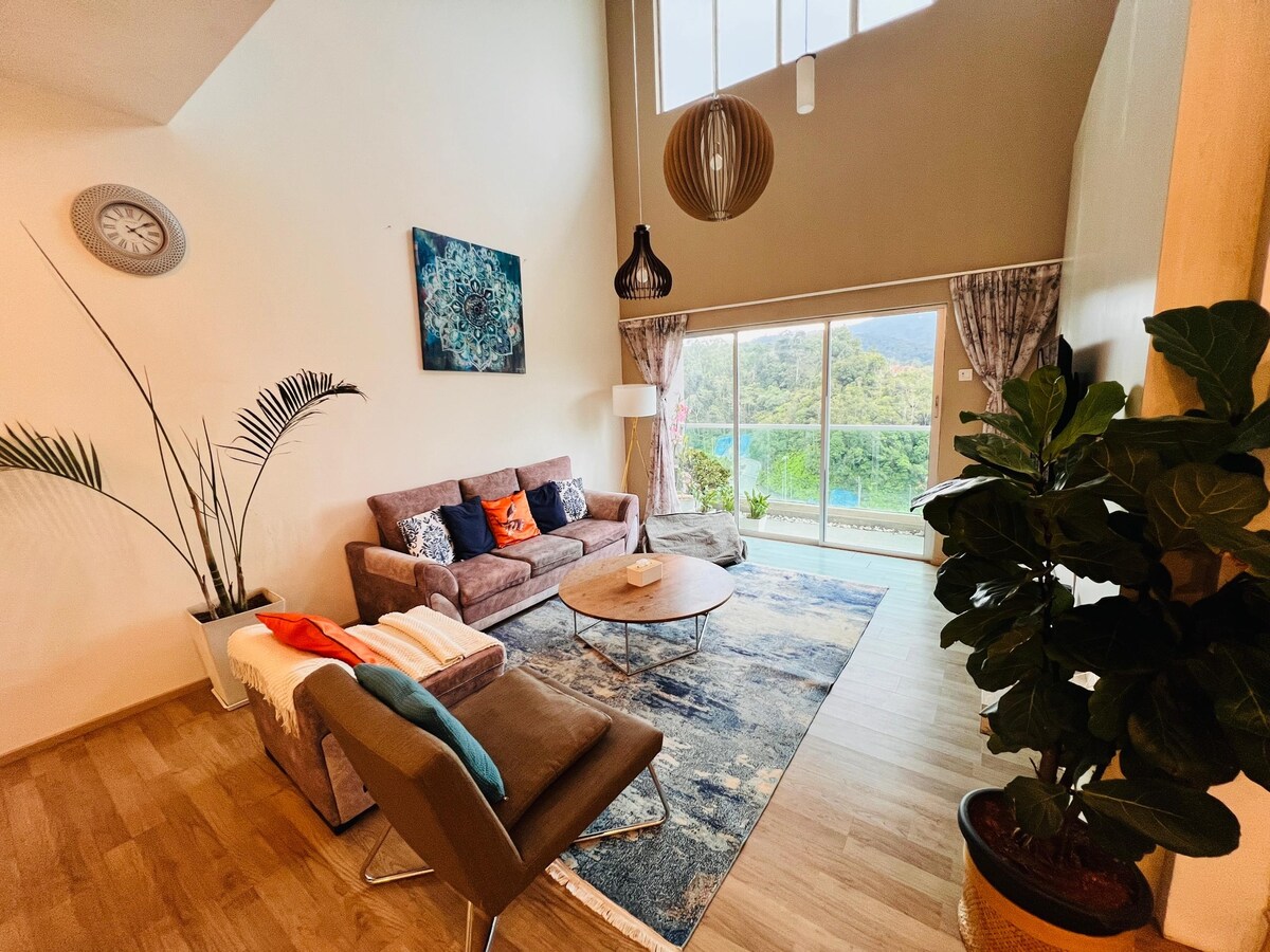 A unique and spacious family friendly getaway situated in the heart of Cameron Highlands.Central yet peaceful enough to make it a perfect zen getaway for your holidays in the highlands! Our unit is a 3 storey penthouse with a rooftop patio and dining area with a view! Being bigger, this unit is able to sleep 8-10 pax with 4 queen beds and 3 sofas, and 4 full baths-perfect for large groups! Centrally located, just 5 mins away from Tanah Rata town, conveniently near to restaurants and amenities.