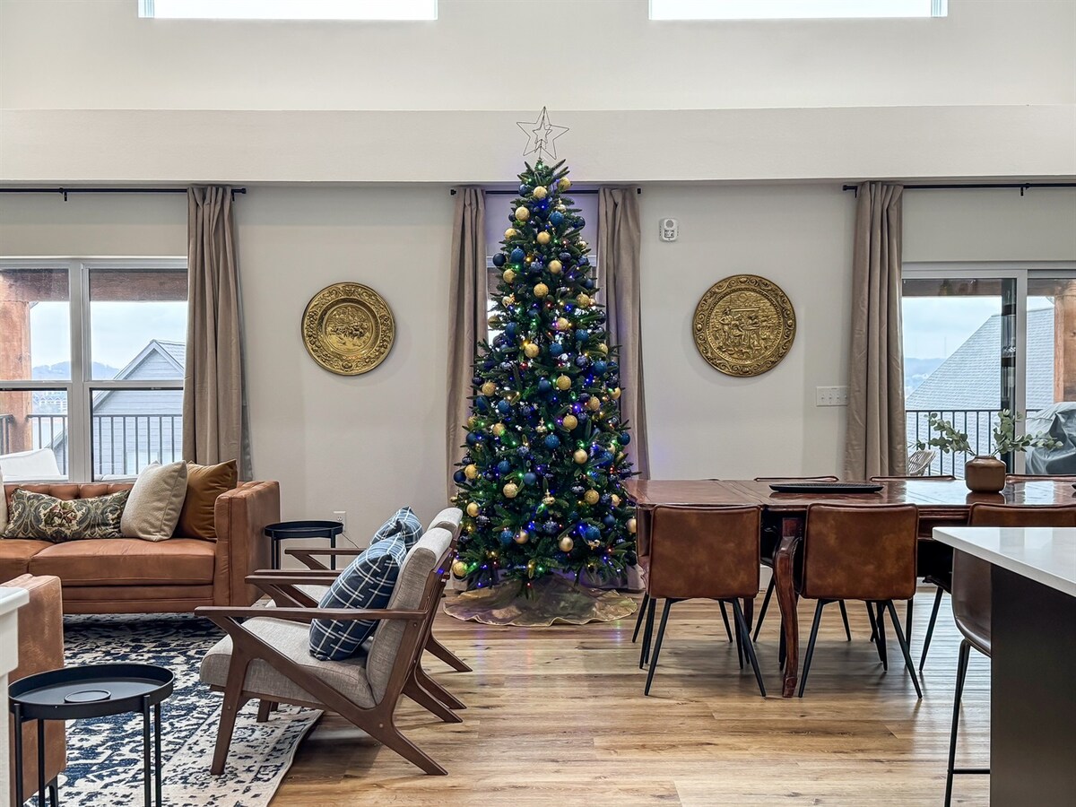 CHRISTMAS DECOR GOING UP FIRST WEEK OF NOVEMBER! Brand New! Indoor & Outdoor Pools (Indoor pool is heated!), great location (10 mins to Silver Dollar City, 6 mins to Branson Strip), panoramic views from the top of the hill, and incredible interior design. The lodge also features a private hot tub, a putting green, a game room, oversized front-loading washer/dryer, a feature record wall, and more!