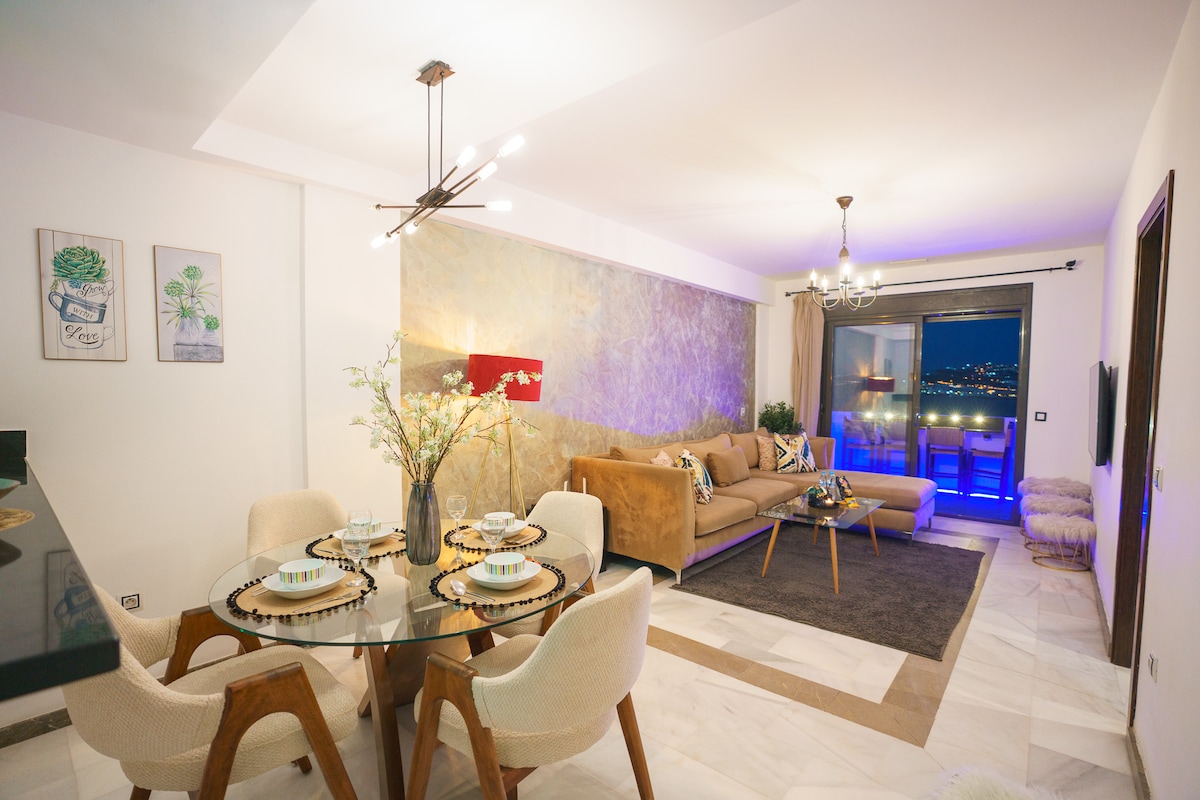 ✨ Enjoy a stay in a luxurious apartment 🏙️ with panoramic views of the sea 🌊 and Spain 🇪🇸. Located in the heart of Malabata, on the lively corniche, just steps from beaches 🏖️, restaurants 🍽️, and shops 🛍️. Modern and fully equipped ✅: air-conditioned living room, open-plan kitchen, 65” TV with Netflix, balcony, Skyview ceilings, solid wood furniture, baby crib, foldable desk, super-fast Wi-Fi, and a small swing for children 🎠.