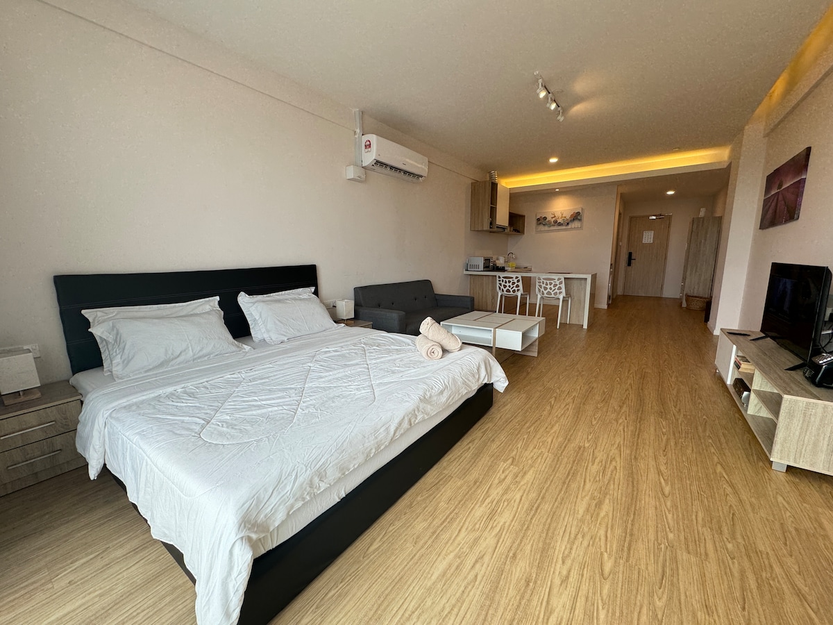 DELUXE STUDIO SUITES ~Sunset • Seaview Solo | Romance Couple | Business Trip | Small Family Bed Type : 1 King Bed & 1 Sofa Bed ( Chargeable ) Sunset Tanjung Aru & Seaview Level : 10, Size : 592 sqft 设施包括: •无线上网 • 50 英寸智能电视(YouTube ,Netflix ) •智能密码锁 •一部3匹空调 •热水器 •微波炉 •电磁炉 • 厨房和炊具•饮水机 •洗衣机 •冰箱 •吹风机 •浴巾 ( 每天每人一件) •沐浴露和洗发水 ( 没有拖鞋牙膏牙刷)