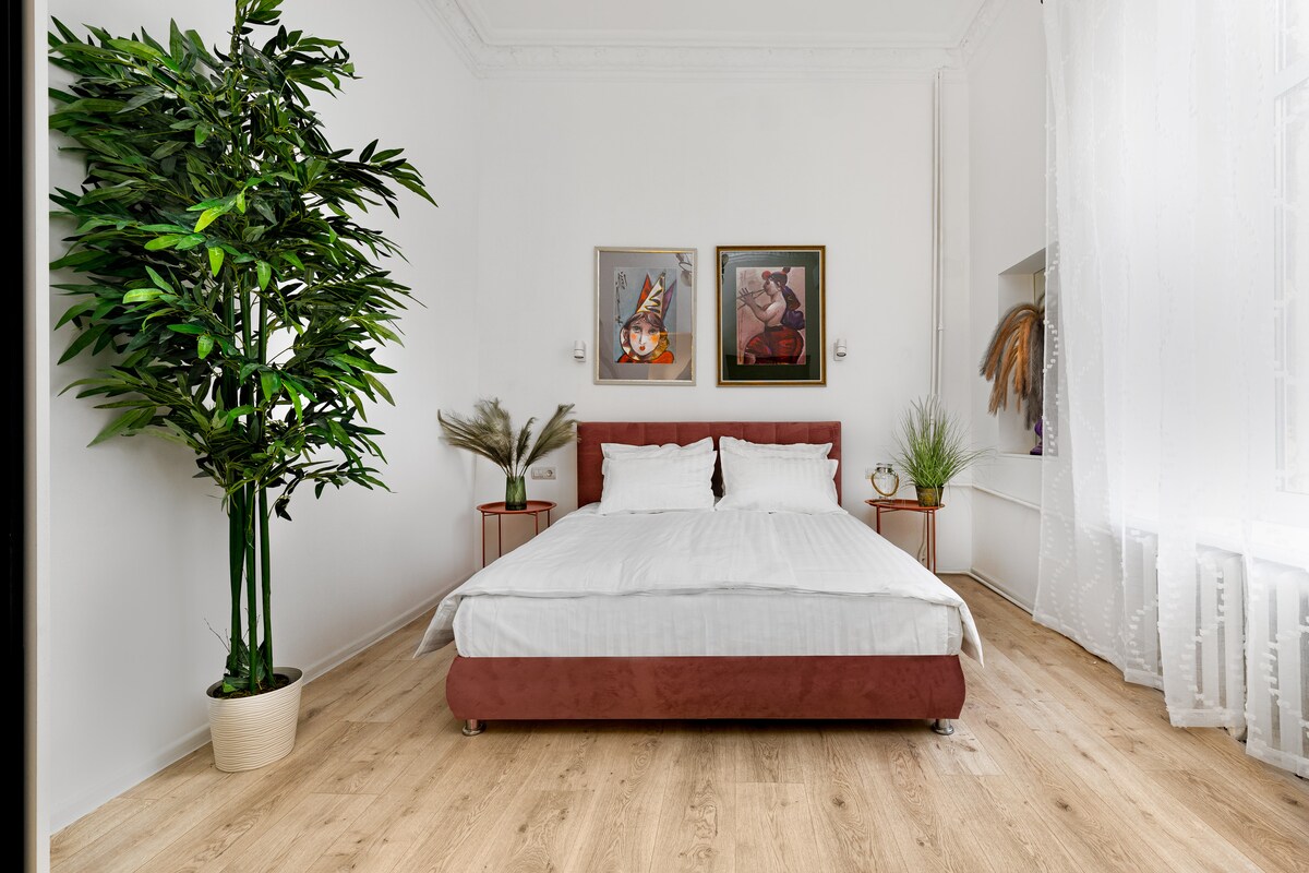 A stylish apartment in the center, designed in Scandinavian style with vintage furniture and modern art. It is located a 15-minute walk from the beach and 10 minutes from the central park, surrounded by many restaurants and bars. A pre-revolutionary building with a cozy Odessa courtyard. The apartment features a separate bedroom with a double bed and a comfortable sofa bed in the living room. The apartment is fully equipped with everything you need.