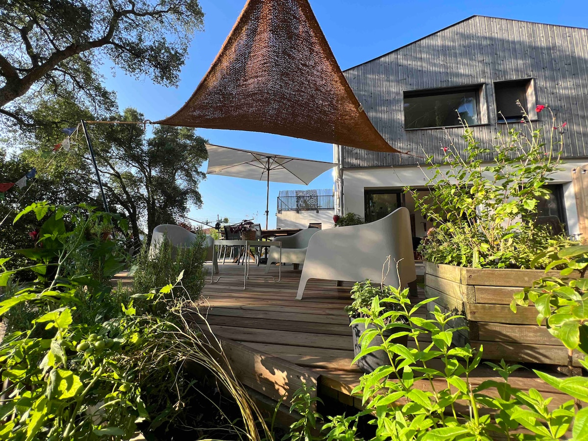 Maison neuve de 100m2 entre mer et golf, très lumineuse , vue sur le golf de Biarritz , spacieuse avec deux chambres se situant à cinq minutes à pied de l'océan, où vous pourrez dîner dans de nombreux restaurants. Commerces en bas de la rue. Parking et jardin de 3500m2 ambiance balinaise/ japonaise avec transat, coin tchill, barbecue , brasero ...ambiance zen garantie :)