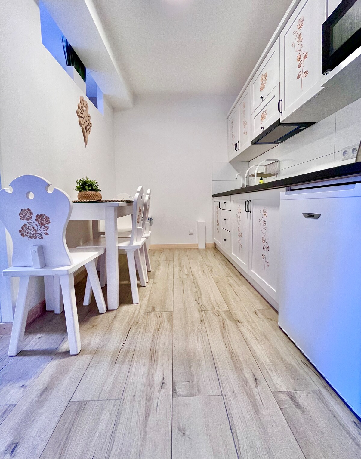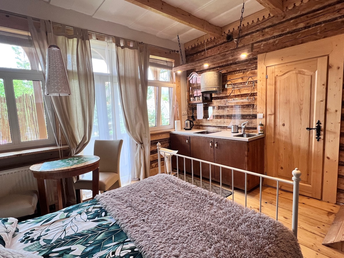 The stylish apartment is located in the over 100-year-old wooden Villa Jasna, after renovation, in the center of Zakopane, close to the station and Krupówki. The building is located on a side street, surrounded by a lot of greenery, and a parking space. The apartment has a double bed 140x200, a kitchenette, and in it an induction cooker, sink, small fridge, dishes, cutlery, electric kettle. Next to the bed, there is a dining area, a comfortable bathroom with a rain shower. There is also a balcony overlooking the garden behind the house.