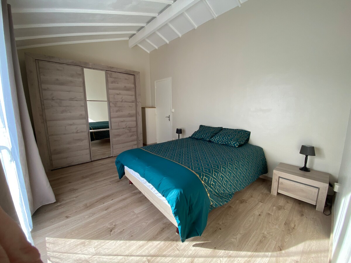 Ce logement paisible offre un séjour détente pour toute la famille. Il est constitué d'une cuisine toute équipée avec lave-vaisselle, micro-ondes, bouilloire, nespresso. Un sejour avec une tv, WiFi et une vue dégagée. Une salle d'eau, une chambre avec un lit double et une chambre avec deux lits simples. Au sous sol: machine à laver, étendoir, salon de jardin, barbecue. Place de parking A 7min d'un supermarché kit bébé: lit, chaise haute, jouets, couverts et assiettes adaptées.