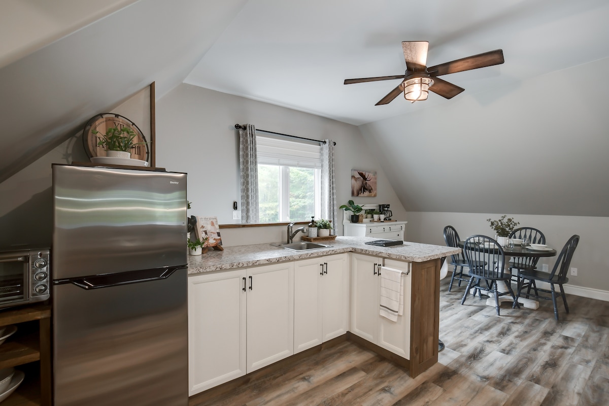Our charming upper studio private suite is located on a quiet treed street in beautiful Collingwood. Its decor celebrates the charm of small town life, celebrating a connection to nature and setting a happy vacation tone. It's a ten minute walk to our historic downtown, offering unique shops, galleries and creative places to eat and drink. Sunset Point Park is closeby and a network of more than sixty trails is one block away. We are a ten minute drive to Blue Mountain where adventure awaits.