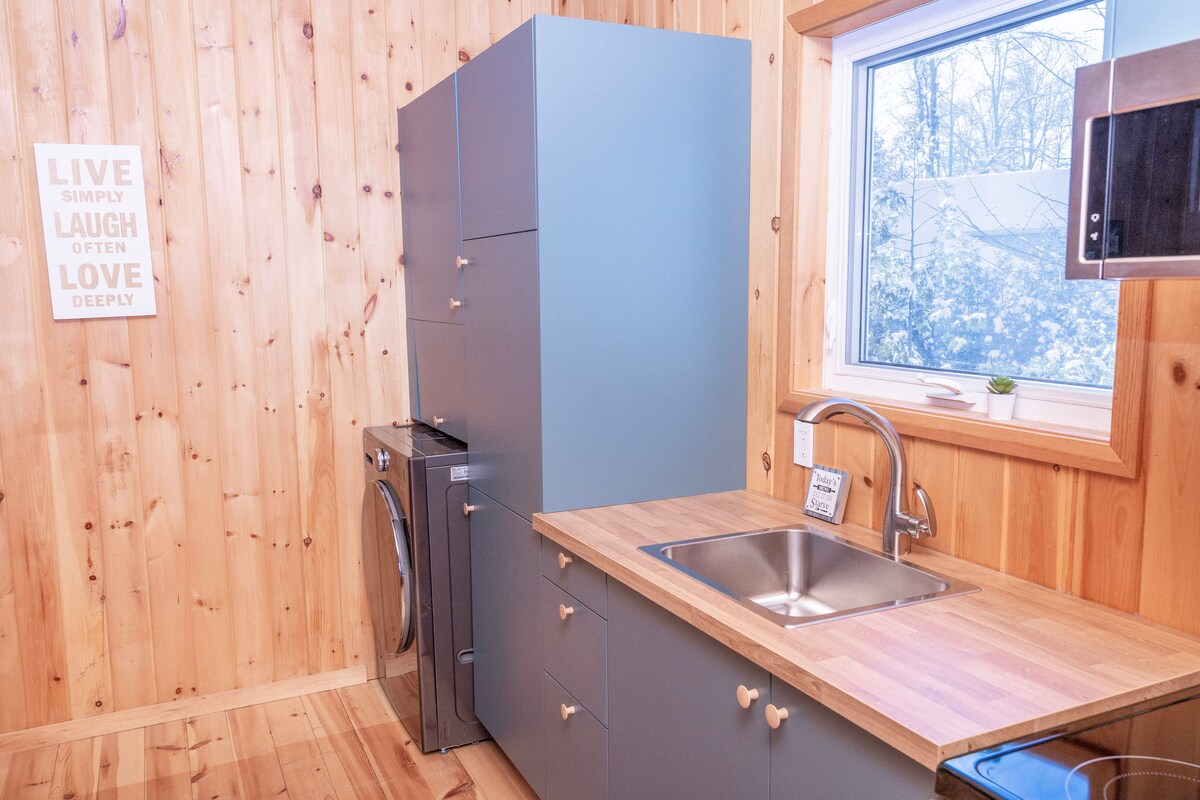 Tiny Home Tranquility! Located just 15 minutes from Blue Mountain Ski Resort and Wasaga Beach. Walking distance to Collingwood downtown core and Georgian Bay . A custom built tiny home with all the amenities needed for a perfect getaway. The Tiny Home has a separate entrance and private back patio giving guests lots of privacy. For the ultimate relaxation experience, you can add access to the sauna as an optional upgrade to your stay. Absolutely no pets due to Allergies