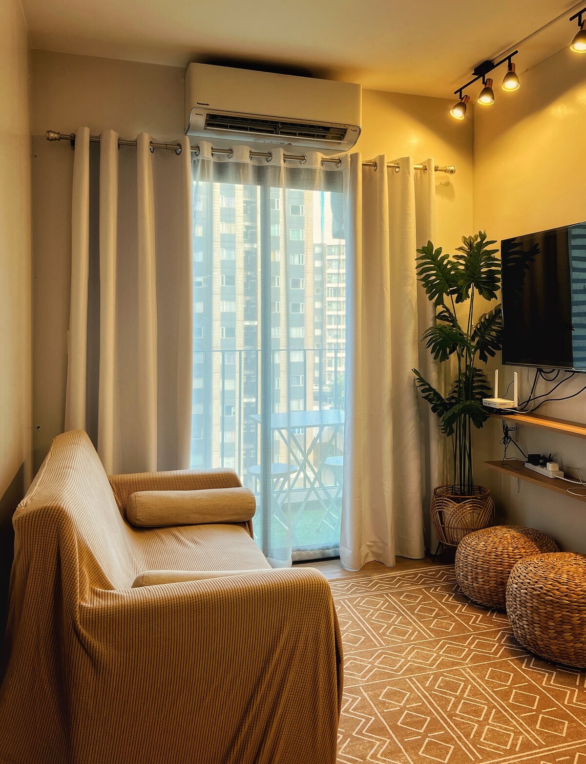 Situated on the 3rd floor of an apartment building, enjoy your stay here with your friends and dine outside the patio! What we have: -AC -Unlimited WIFI -Bingewatch all night as we have NETFLIX -Kitchen with single Induction stove + complete utensils -Refrigerator What we don't have: -Water heater -Projector (the one in the photo) is owned by the previous tenant -Parking area (but there's limited street parking for motors)