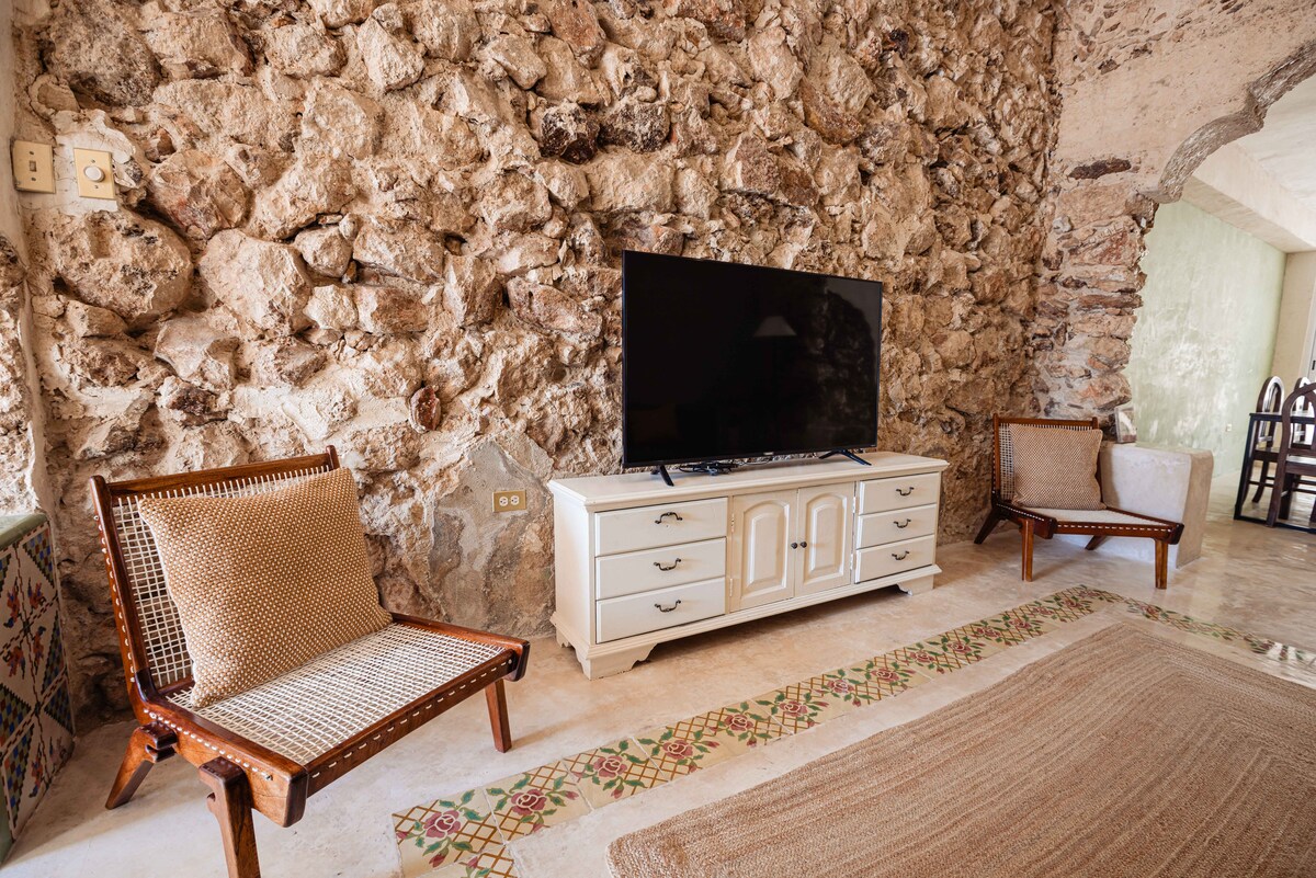 Spacious apartment inside colonial house, perfect for 2. Located east of downtown Mérida, near the ChemBech neighborhood, only a 20-minute walk from the main square. It welcomes travelers seeking calm and introspection. Unique in style and design, with luxury finishes, it guarantees privacy away from the hustle downtown. The apartment is completely private, on the lower level. It has a fully equipped kitchen and living room, a pool, a garden, a terrace, one king bedroom with a marble bathroom.