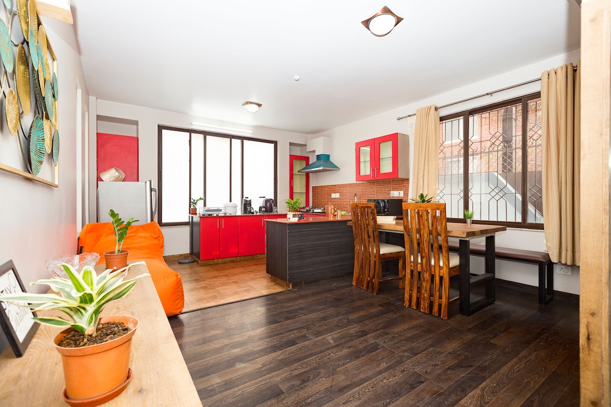 Escape to a stylish, European-inspired studio on the top floor in central Kathmandu. This private and quiet retreat is perfect for solo travellers, couples, or remote workers, comfortably fitting two guests. Enjoy a king bed, dedicated workspace with ultra-fast Wi-Fi, and a shared rooftop terrace with BBQ. All this is just a 12-minute walk from the vibrant Thamel district, offering a serene base for exploring the city.