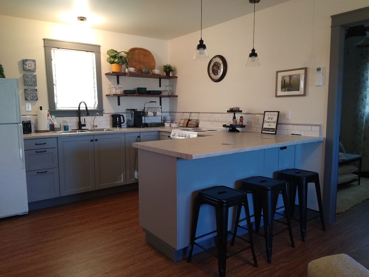 Beds/NO LINENS Showers/ NO TOWELS Kitchen/sink mini fridge no stove outside grill, fire pit, and cast iron provided. Dishware, silverware, and cooking utensils provided. Things you will need to bring: Linens, pillows, towels, dish rags and personal hygiene items. We will provide enough trash bags, toilet paper, dish soap to get you started after that its renters responsibility. We have state certified kilm dried firewood for sale $6 bundle. Coffee Pot take both grounds and k-cups. 4 lawn chairs.
