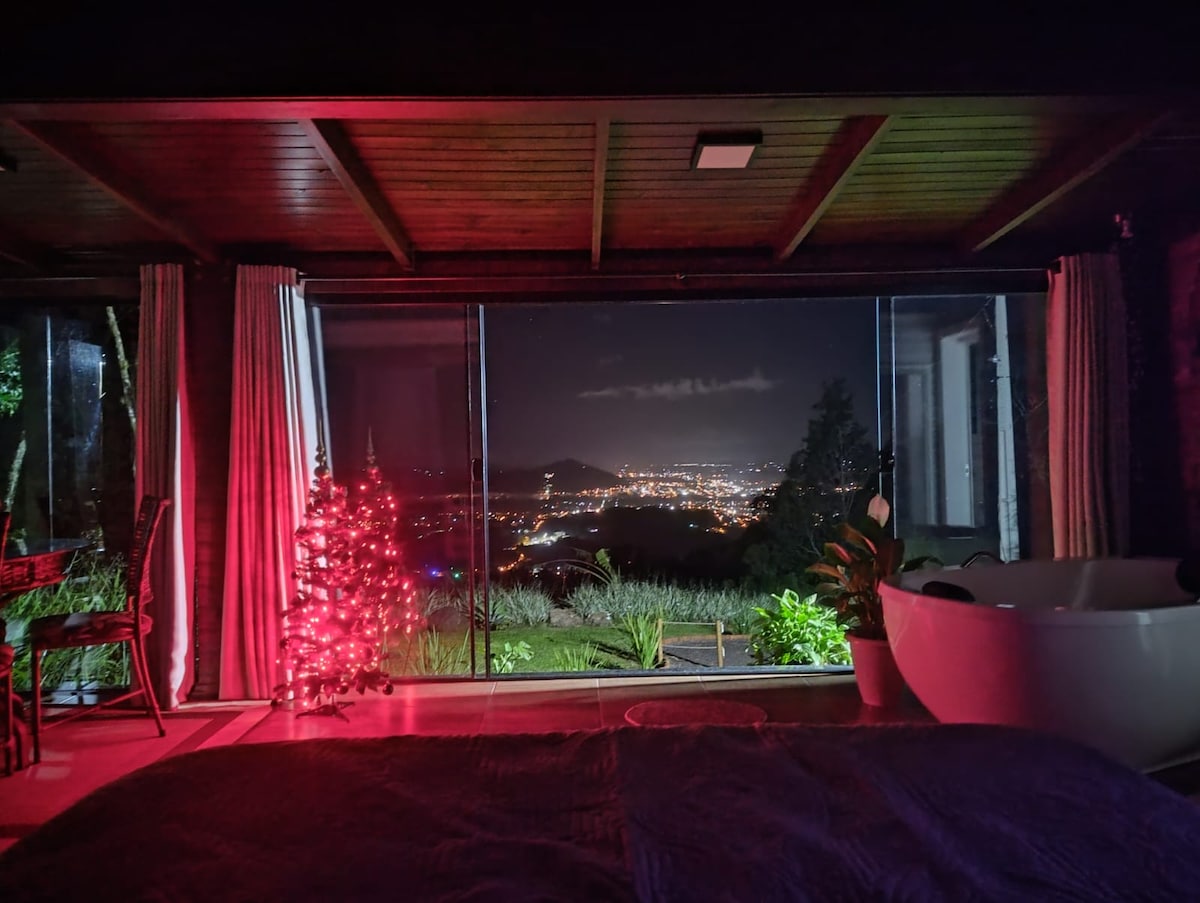 Cozy cabin ideal for those who want peace and contact with nature, but without giving up comfort. It unites the rustic with the sophisticated, with exclusive furniture made of wood during construction, but also with a hot tub and gas shower, queen bed, air-conditioning, Wi-Fi and kitchen. A luxury accommodation in the midst of nature. It is located at the top of Zuckerhut hill, in the town of Ano Bom, in Colinas/RS. From the deck, you can enjoy an incredible view of the valley and enjoy the sunset.