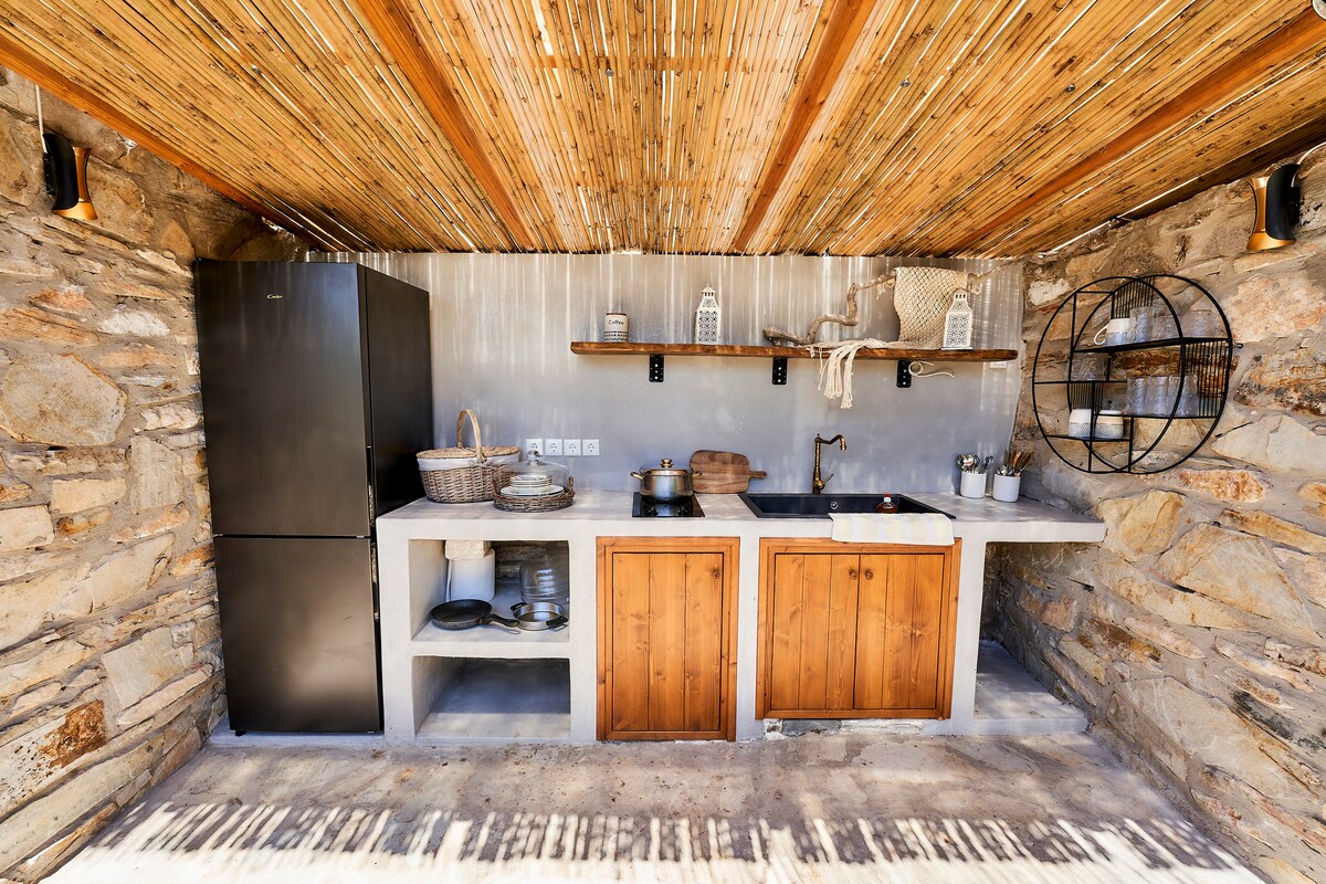 Villa "Palm" in Elea stone houses, in traditional Greek style on the island of Thassos, approximately 75 square meters to 2 floors within an olive grove with sea view from balcony . There are 3 houses in a plot of 4220m2. Kitchen, Bath with shower / toilet with solar water heater, living room with sitting area, fireplace. Upper floor with 2 bedrooms. Wooden optic windows and doors with mosquito nets. Outside: Natural stone terrace shaded with pergola in a peaceful organic certified olive groove.