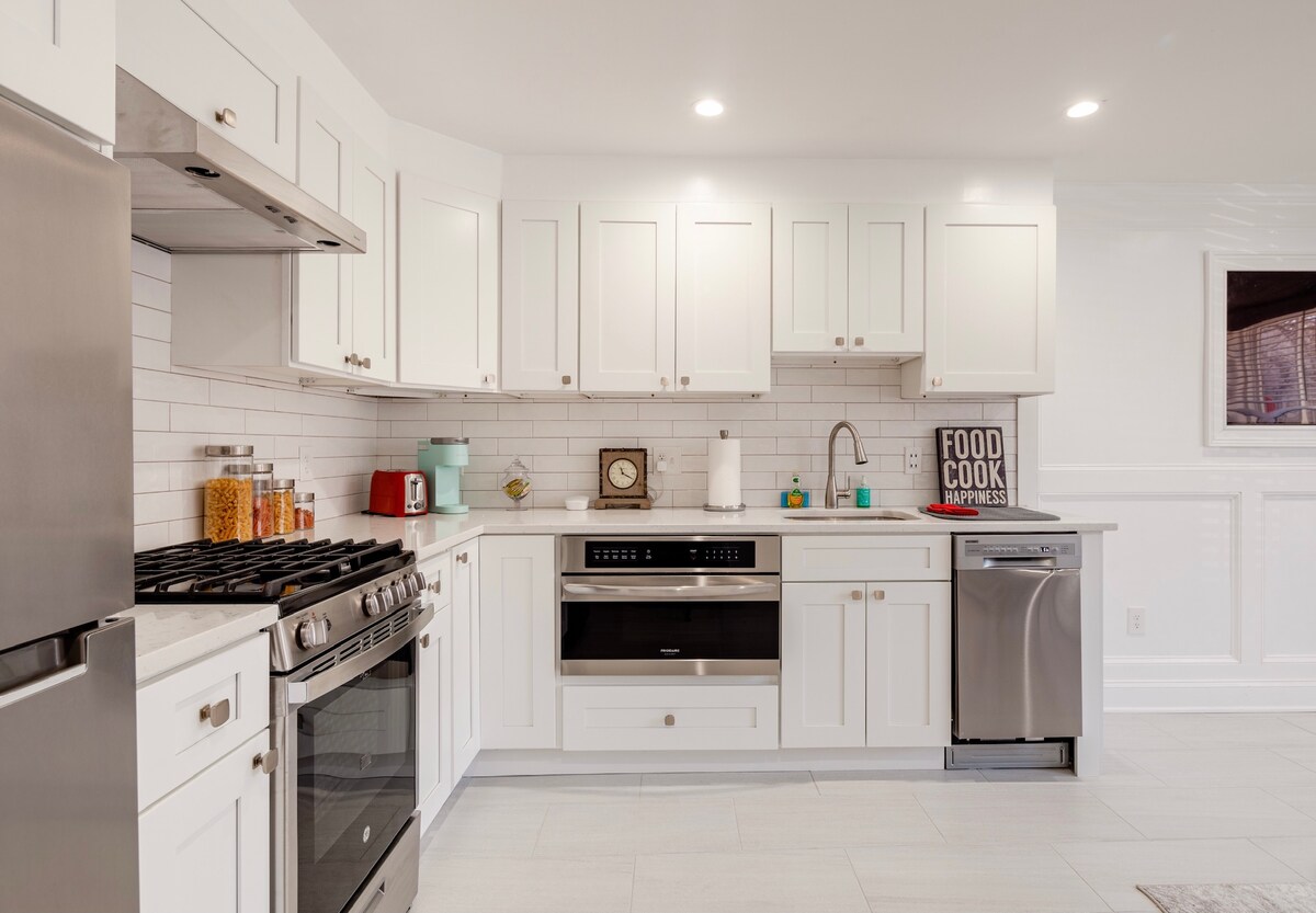 Inviting 1BR suite ideally located between the National Mall and the Wharf. Boasts a fully-equipped kitchen with new appliances, a comfortable bathroom with a tub, and in-unit washer/dryer. Includes a cozy pull-out sofa and private entrances. A perfect choice for tourists and business travelers seeking comfort and convenience in central DC.