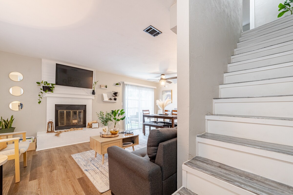 Beautiful townhome in a well established, quiet, family neighborhood! This home offers a split floor plan with the main living areas (kitchen, dining, living room, and half bath) downstairs and 3 spacious bedrooms upstairs. The master features a king size bed and private bathroom. There are two additional bedrooms (one with a twin over full size bunkbed and one with a queen sized bed and traditional desk/workspace) that shares a hall bathroom with a stand up shower and double vanities!