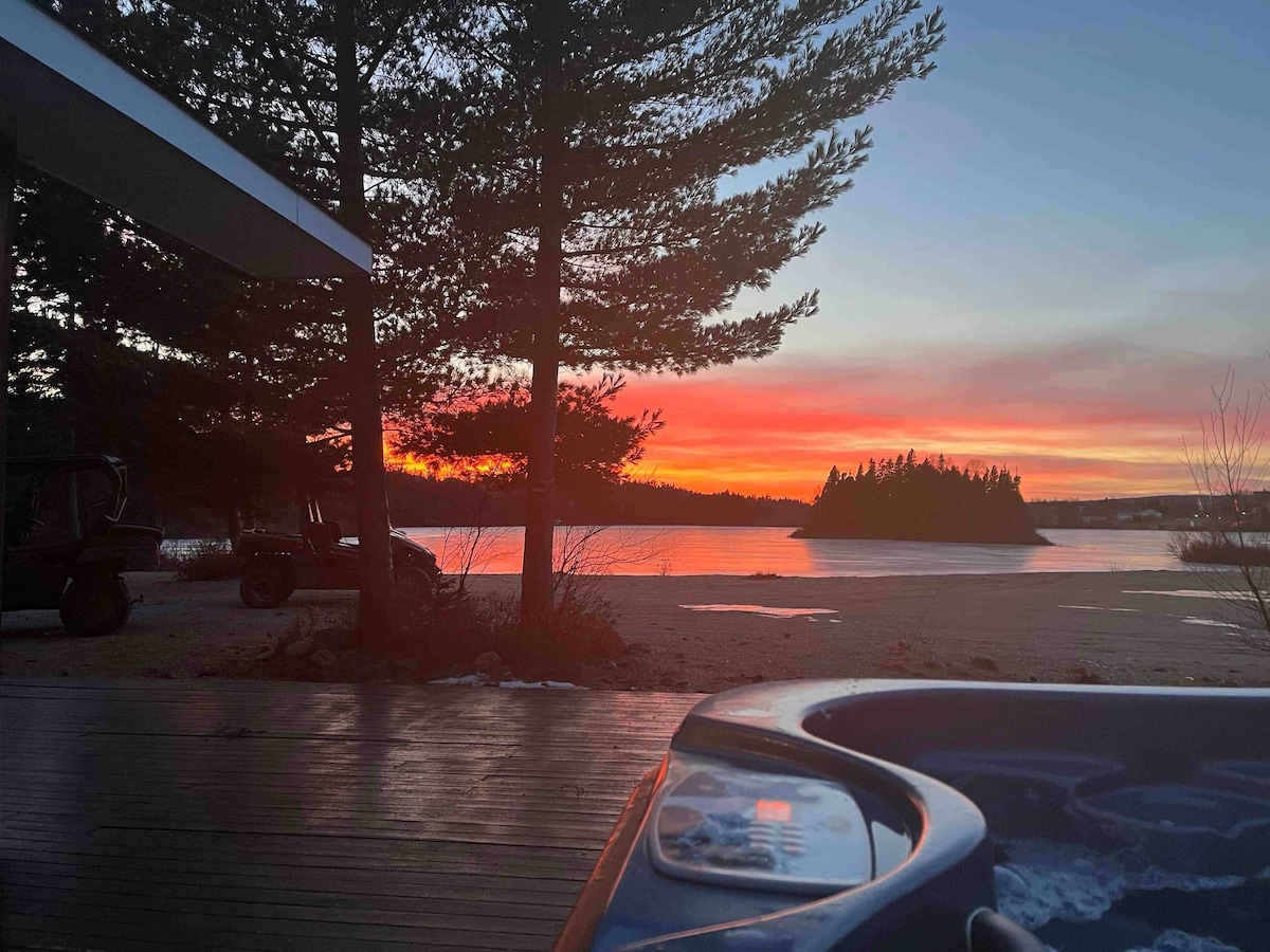 This cabin is a great getaway for all types of stays and vacations in the Town of Terra Nova! It offers 3-bedrooms with a beautiful open concept with WIFI and TV. Large full bathroom that includes washer and dryer. There is a large patio that includes a BBQ and Hot Tub with a beautiful view of the sandy beach and pond. Perfect for all season outdoor activities or even sitting inside the cabin with the wood stove or pond view through large windows.