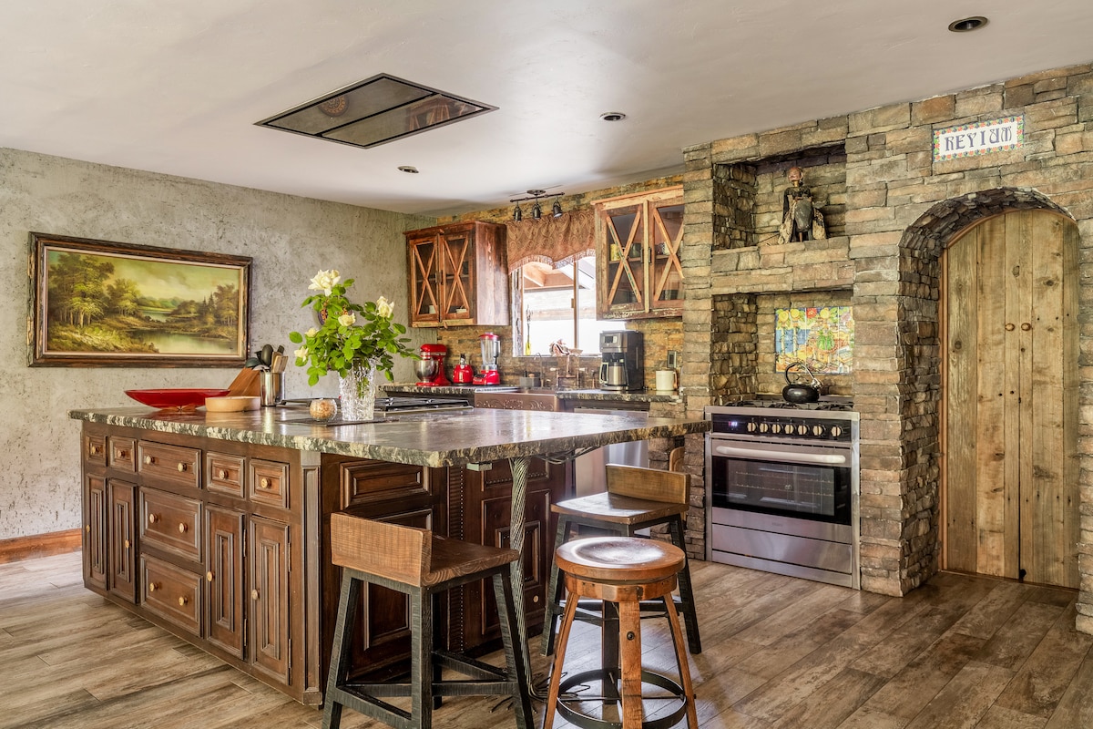 Escape to a wish-listed artistic sanctuary! This unique, castle-like riverfront villa at the foothills of the Sequoias is an experience. Set on 6 private acres with its own 2-acre nature preserve, this home inspires creativity and connection. Features a waterfront hot tub, rooftop observatory, and gourmet kitchen. Perfect for families and groups seeking a magical retreat.