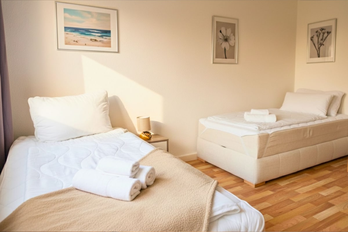 The Bohème-style apartment is very central and just a few steps away from the train station. ► 25m² 1-room apartment with high quality equipment ► Central Station 3 min. Walkway ► Queen size bed with top mattress ► free parking 10 min. Footpath ► Cornflakes & Milk 🥣 ► 43 inch TV with Netflix, Amazon prime & 🍿! 📺 ► Saunaraum 🧖🏻♂️🧖♀️► sports room 🏋️🏋️♀️ ► optional baby cot 👶🏻 ► Yoga mat! 🕉️ ❗On request: Early check-in/Extra sofa bed for 3 persons possible