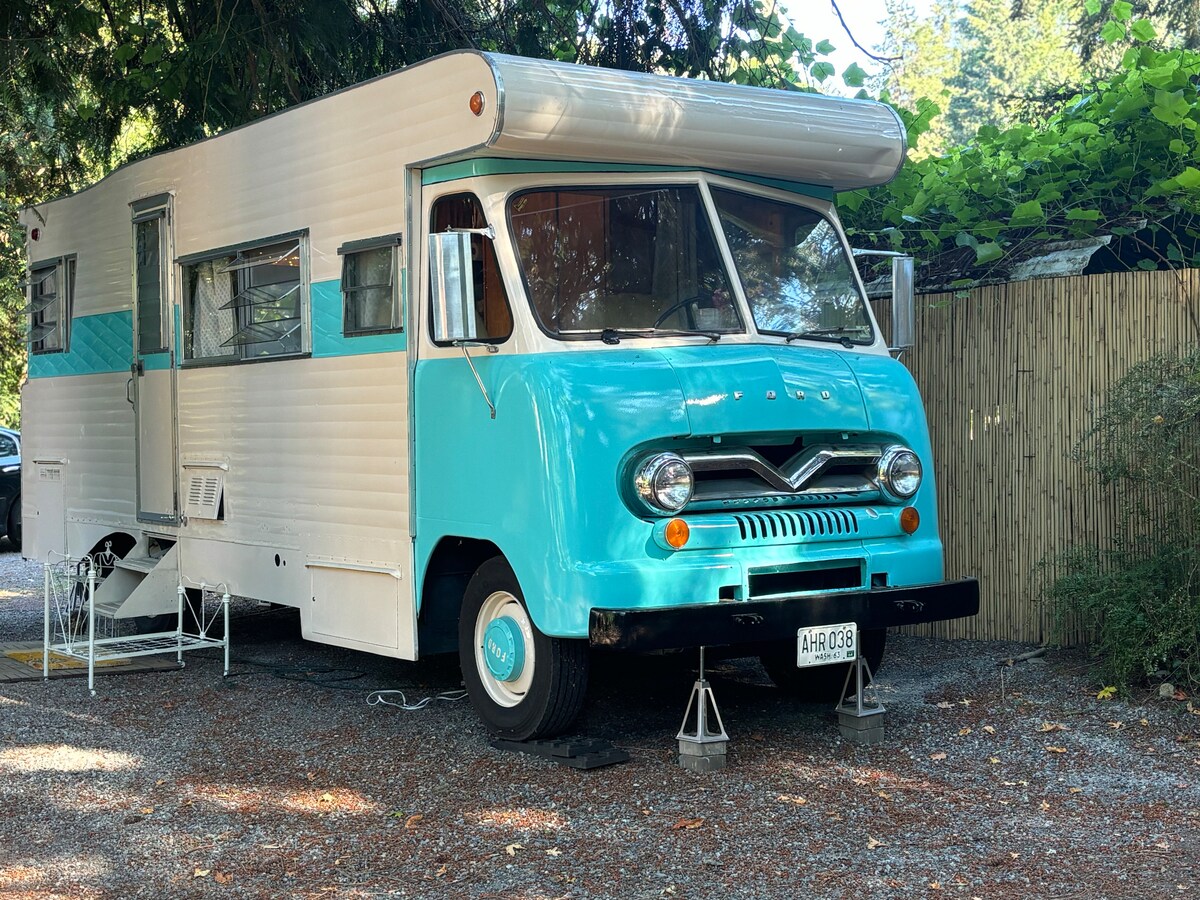 Come stay in “Isabel”…a retro one of a kind Ford RV, surrounded by majestic cedars in a serene setting. She has original wood paneling, with upgraded heater/AC unit to give you a cozy experience any time of year. She is parked on our extra large lot aside our shared front gardens/patio with a smokeless fire pit/grill to enjoy outdoor cooking or campfires. Her tiny bathroom has a sink and toilet and there is an outdoor insta-hot shower tent alongside a 8x14 ft swim spa/hot tub!